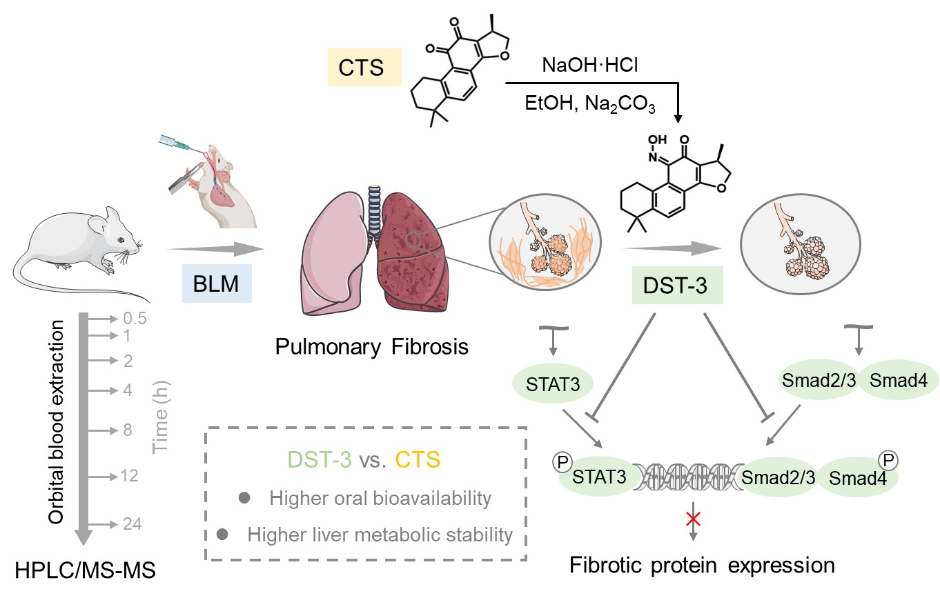Guan, R.; He, X.; Dai, Y.; Huang, G.; Xue, Z.; Chen, J.; Liu, P. DST-3, a Novel Modified Cryptotanshinone, Protects Against Pulmonary Fibrosis via Inhibiting STAT3/Smad Signaling Pathway and Improves Bioavailability. Pharmaceutics 2025, 17, 1307. https://doi.org/10.3390/pharmaceutics17101307