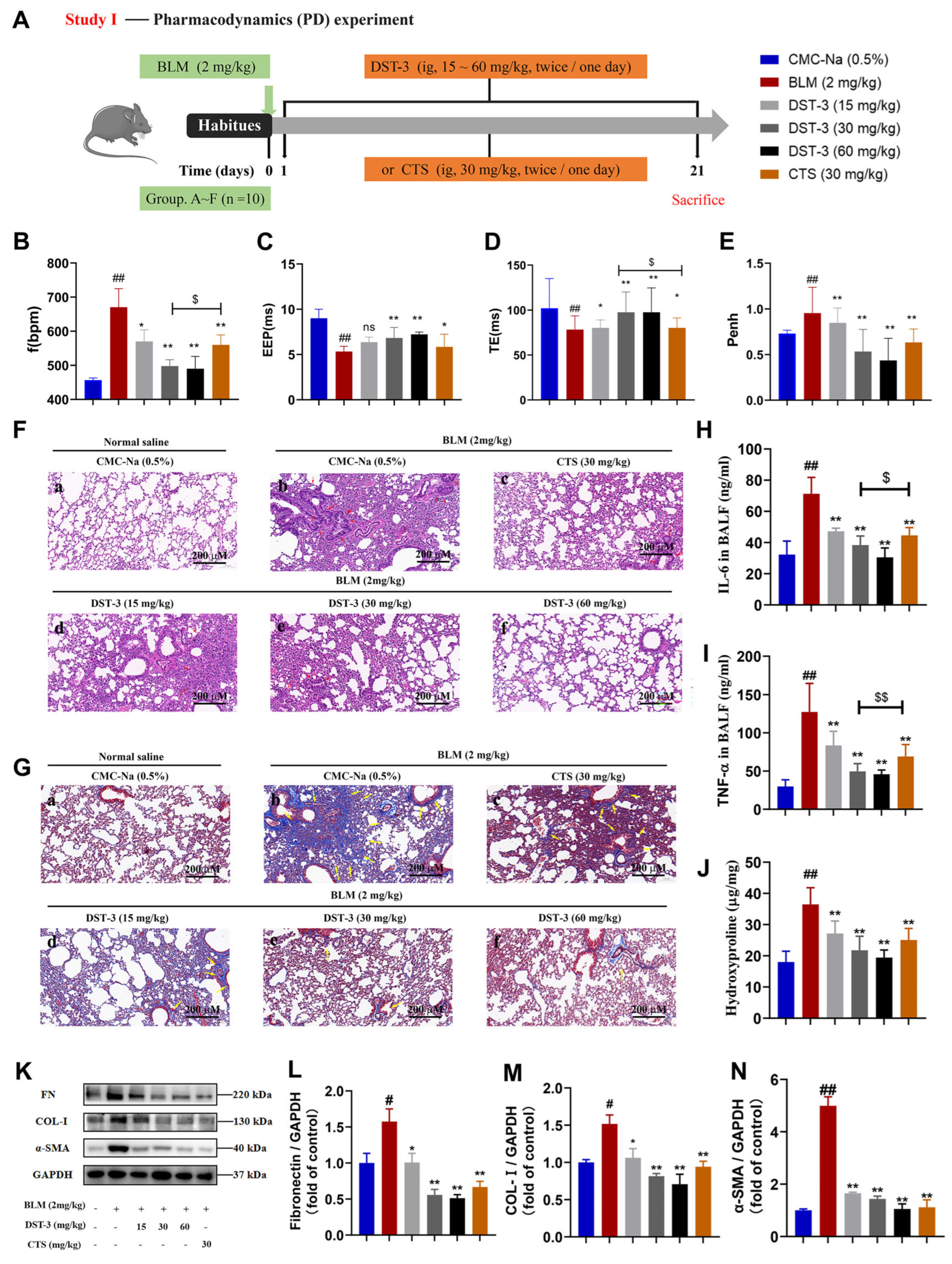 3.1. DST-3 Prevented BLM-Induced Pulmonary Fibrosis in C57BL/6 Mice