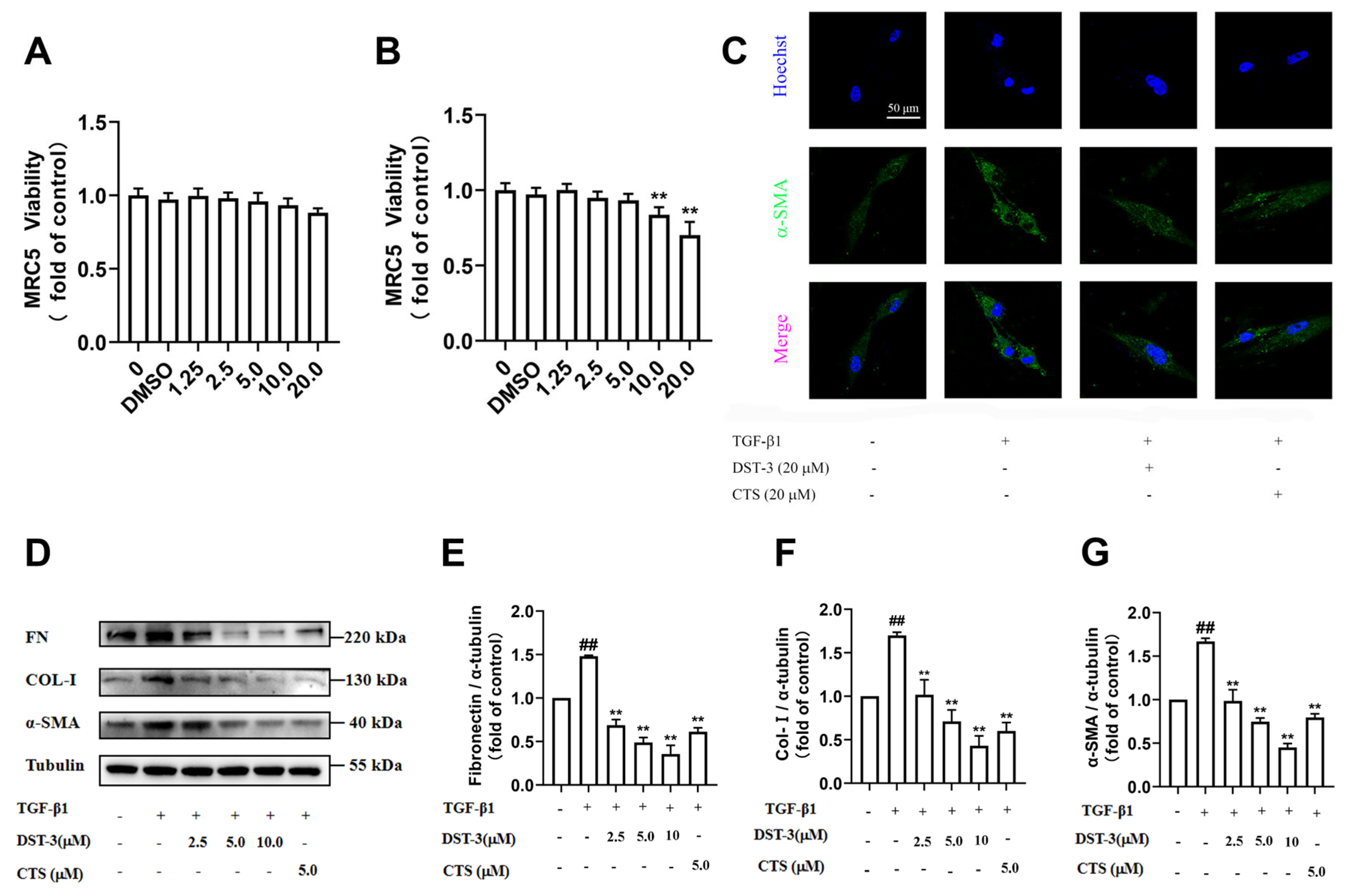 3.2. DST-3 Prevented TGF-β1-Induced Pulmonary Fibrosis in MRC5