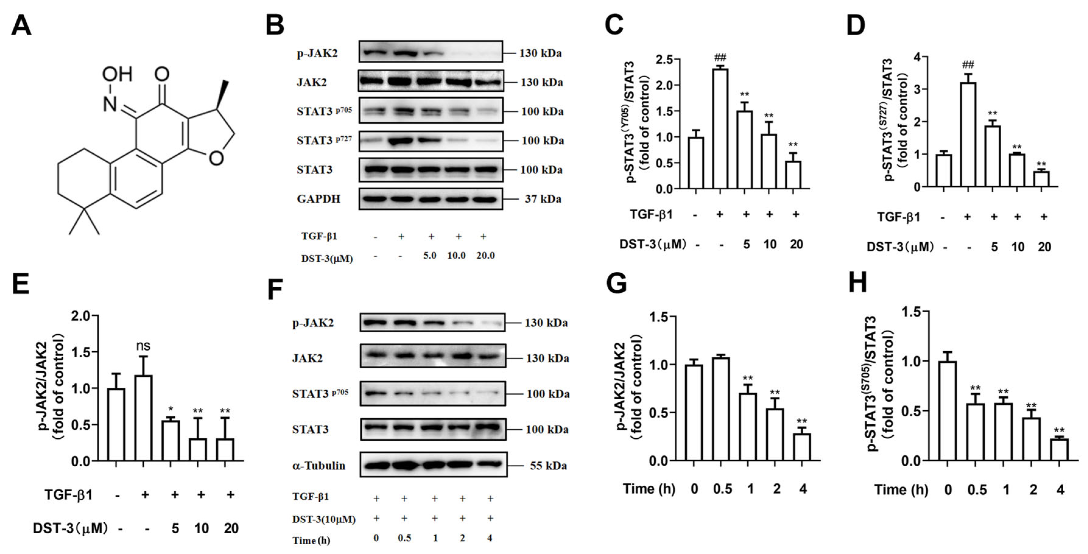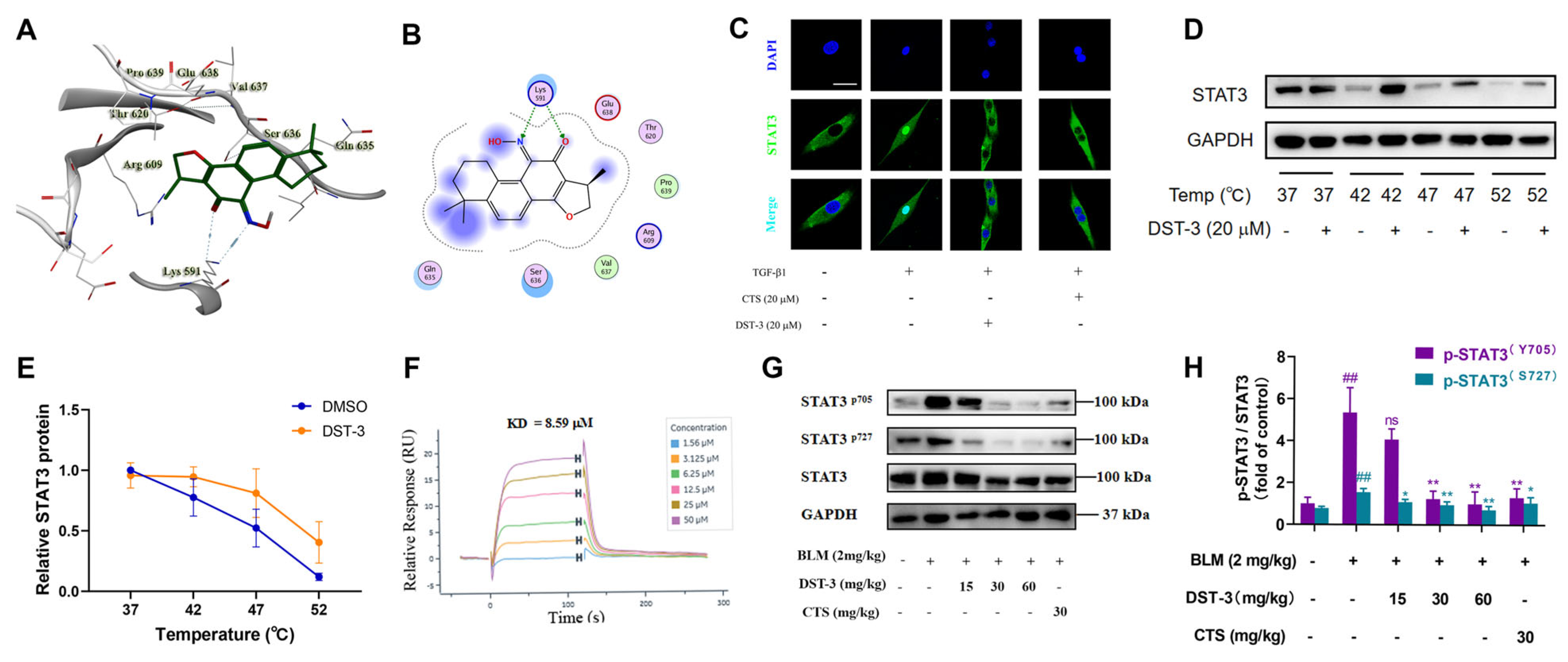 3.3. DST-3 Prevented Pulmonary Fibrosis by Directly Binding STAT3 to Inhibit JAK2/STAT3 Signaling Pathways