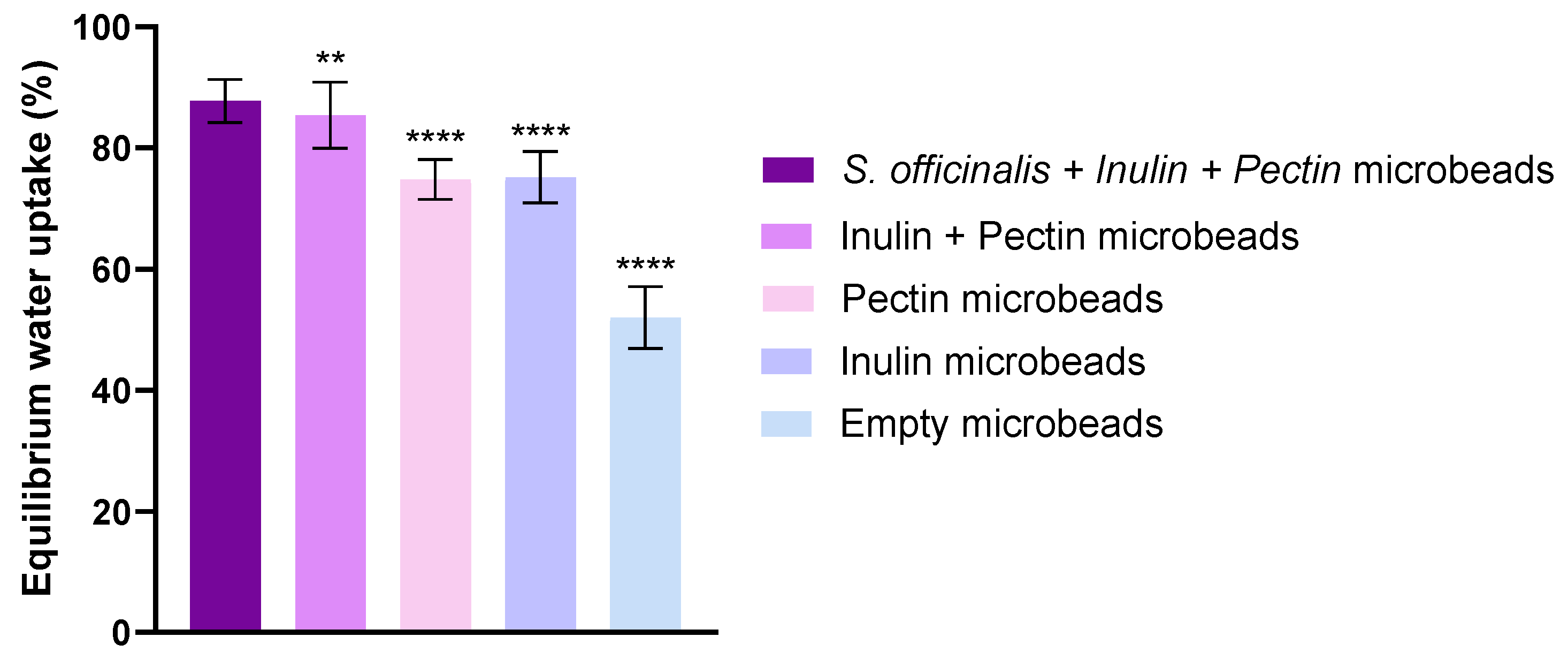 The hydration properties of various formulations were assessed by swelling analysis. To evaluate the water uptake capacity, 50 mg samples of different microparticles were immersed in 50 mL of purified water. The tested formulations included beads containing only inulin, only pectin, both inulin and pectin, a combination of inulin, pectin, and S. officinalis extract, as well as empty microbeads without any active components. The suspensions were stirred at 37 °C using a Radelkis OP-912 magnetic stirrer (Radelkis, Budapest, Hungary).