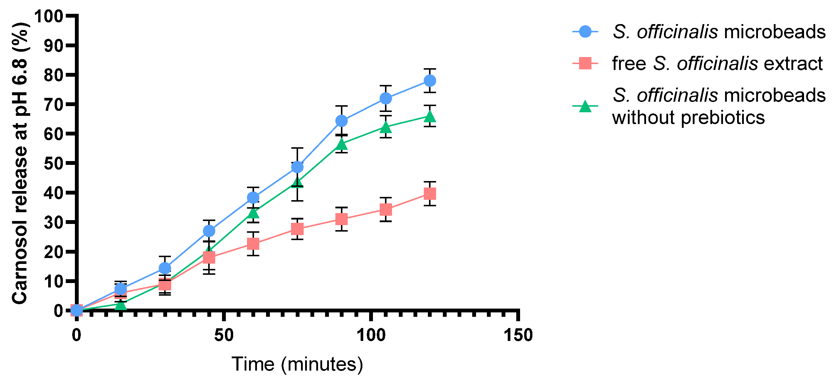 95]. Thus, while only carnosol was quantified spectrophotometrically, the controlled-release behavior, absence of burst degradation, and literature evidence of prebiotic polysaccharide matrices stabilizing phenolic compounds together support the conclusion that carnosol and other extract constituents were inherently stable under the tested conditions.