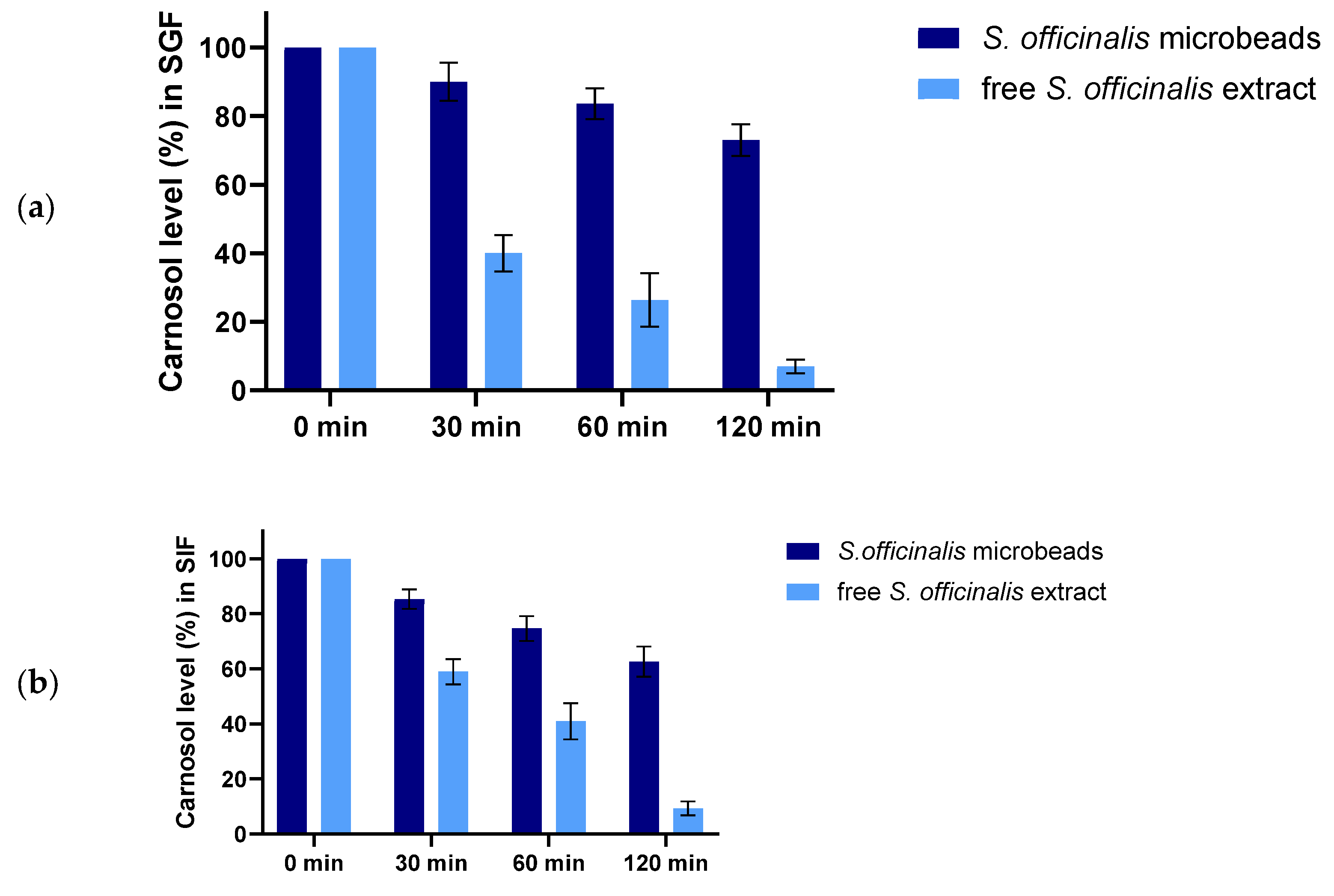 Figure 4b), compared to free sage extract. In the acidic, pepsin-containing simulated gastric fluid the encapsulated extract demonstrated significantly enhanced protection with notably less degradation. This suggests that, while carnosol and other extract components possess some inherent stability, the alginate matrix offers a substantial additional barrier that preserves the bioactive compounds more effectively under these conditions. The slightly superior stability of the beads could be attributed to the physical barrier of the alginate preventing enzyme access to the encapsulated material. The free extract underwent rapid and extensive degradation in SIF. This is a critical observation, as it implies that unprotected sage extract might lose a significant portion of its bioactivity before it can be absorbed or exert its effects in the lower GI tract. In contrast, the