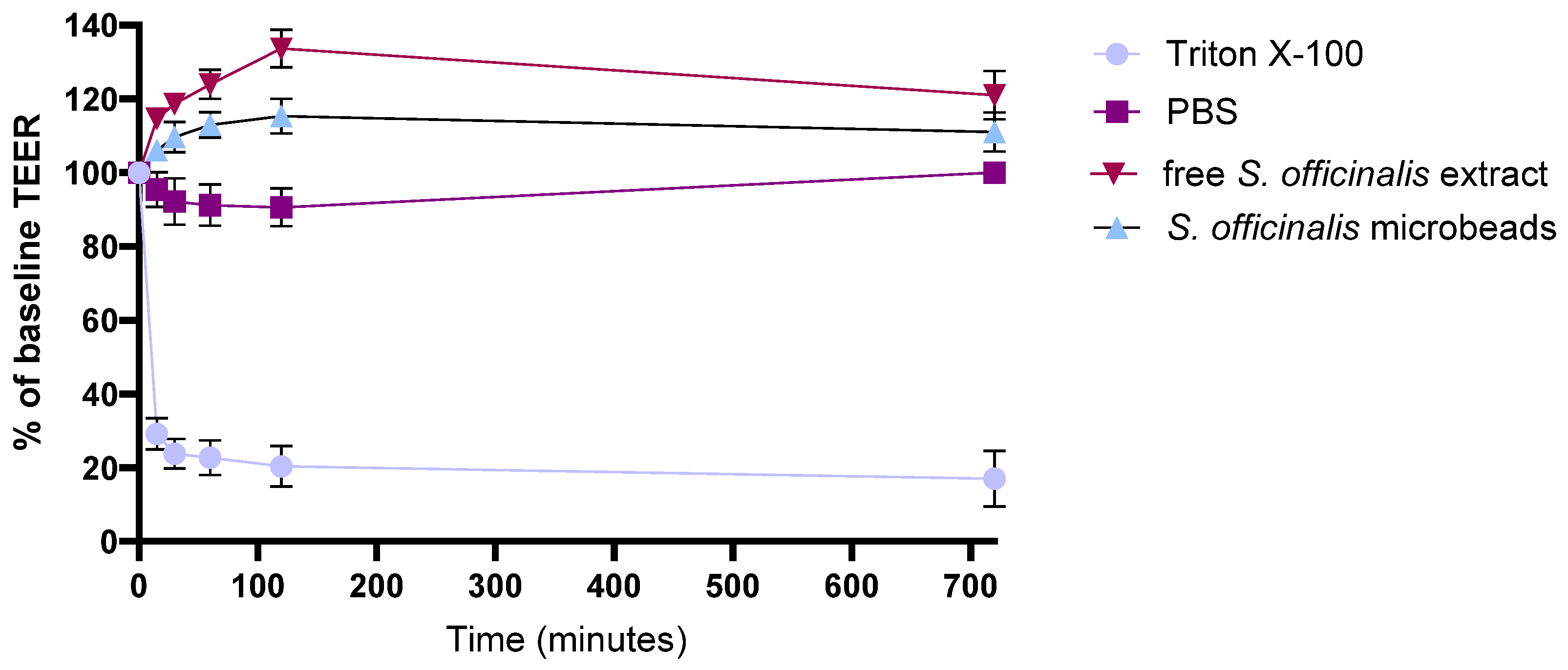 S. officinalis bioactives, revealed that our formulation not only maintained but increased TEER values, indicating tighter paracellular junctions. Under normal circumstances, a rise in TEER would be expected to reduce the movement of compounds that cross via the paracellular pathway. However, a significant increase in the permeation of the bioactive components of the sage into the basolateral compartment was still observed at 2, 4, and 24 h compared to control beads. This is explained by the transport characteristics of carnosol and similar lipophilic constituents, which primarily cross the epithelium via the passive transcellular route, moving through the lipid bilayer rather than between cells [