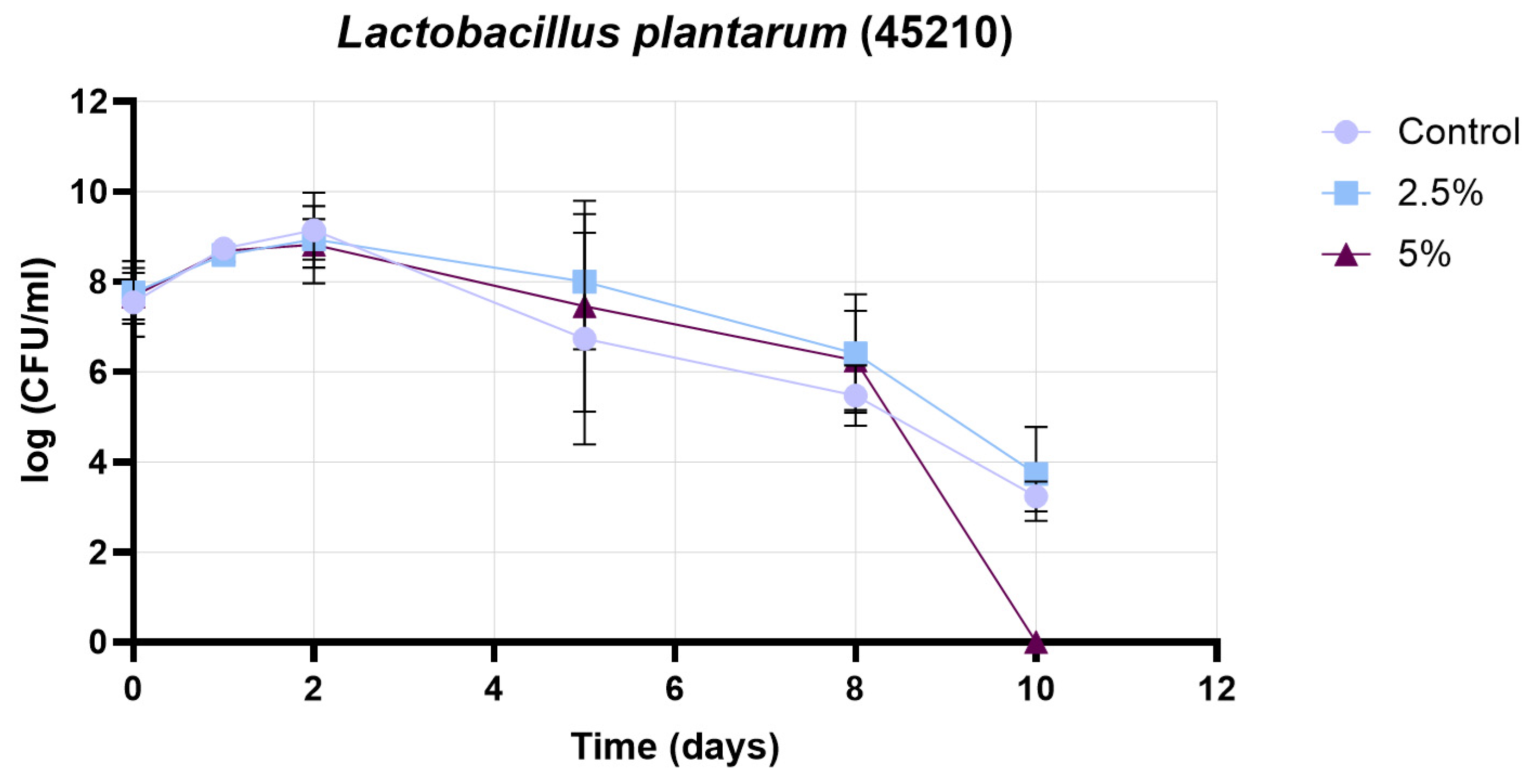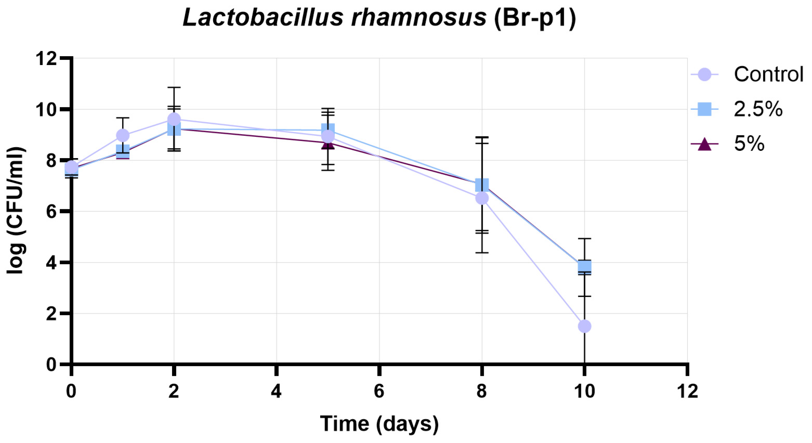 Figure 11), 2.5% proved optimal for long-term viability, with a delayed growth peak but improved survival in later stages (days 6–10), likely due to bacterial adaptation to sage bioactives, as reported by Succi et al. (2017) and Su et al. (2007) [