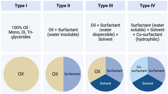 Besides the chemical and physical approaches applicable to the active substance, the galenic approach is a real opportunity to improve the bioavailability of poorly soluble BCS II or IV active substances. The Biopharmaceutics Classification System (BCS) categorizes drugs based on their solubility and permeability. BCS class II compounds are poorly soluble but highly permeable, while class IV compounds exhibit both low solubility and low permeability, making them particularly challenging to develop [1]. Various approaches exist to solve this problem; salts, co-crystals, or polymorphic forms can be used to improve the solubility of the active substance. The galenic approach can also be chosen; for example, amorphous solid dispersions (ASDs), complexation with cyclodextrins, or the use of lipid-based formulations (LBFs) could enhance bioavailability. The choice of a lipid formulation is based on the use of one or more lipidic excipients mixed with the active molecule. Lipid-based formulations are used to improve the body’s exposure to active substances after oral administration. Although the main advantage of LBFs lies in the increase in apparent gastrointestinal solubility, it has also been shown that these formulations can offer advantages in terms of permeability and, in certain circumstances, promote lymphatic transport and improve bioavailability by partially avoiding hepatic first-pass metabolism [2,3,4]. LBFs can appear as Self-Emulsifying Drug Delivery Systems (SEDDSs), and depending on the droplet size formed upon dispersion, they can be further classified as SMEDDS (Self-Microemulsifying) or SNEDDS (Self-Nanoemulsifying). In the 2000s, they were classified with the aim of grouping them according to their composition. This lipid-based formulation classification system (LFCS) was introduced by Pouton [5] and updated a few years later to add a fourth formulation type [6]. LFCS classifies LBFs into four main types, according to the relative proportions of lipids, surfactants, solvents, and co-solvents (Figure 1). Type I formulations are the simplest, comprising active ingredients dissolved in an oily vehicle, such as triglycerides alone or mixed glycerides. Type II formulations include combinations of glycerides and lipophilic surfactants with a low lipophilic–hydrophilic balance (HLB). Type III formulations include mixtures of glyceride lipids and more hydrophilic surfactants with a higher HLB and may also include co-solvents. Finally, a type IV HLB classification was introduced later in response to the growing use of formulations that do not contain traditional lipids. Type IV formulations include only a combination of surfactants and co-solvents without hydrophobic compounds [6]. Beyond SEDDS and other liquid lipid-based formulations, Solid Lipid Nanoparticles (SLNs) and Nanostructured Lipid Carriers (NLCs) represent additional lipid-based delivery systems [7]. SLNs are produced by replacing the liquid lipid of an emulsion with a solid lipid or a blend of solid lipids, resulting in solid lipids dispersed in an aqueous medium and stabilized with surfactants. NLCs were developed to overcome some limitations of SLNs, as they combine solid and liquid lipids as primary structural components. This allows NLCs to achieve higher drug-loading capacity and increase stability during storage.