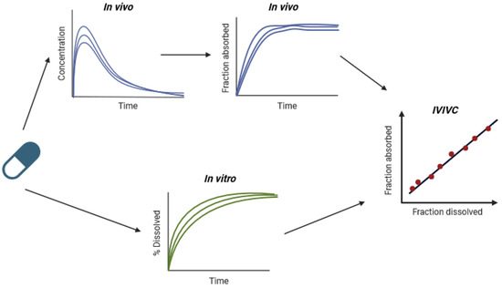 In recent years, the concept and application of in vitro–in vivo correlation for pharmaceutical dosage forms has received considerable attention from the pharmaceutical industry, academia, and regulators. Correlations between in vitro and in vivo data are often used during pharmaceutical development to reduce development time and optimize formulation [10]. From a regulatory perspective, IVIVC enables dosage form optimization while minimizing the number of clinical trials in humans. In addition, they can be used to establish dissolution acceptance criteria and serve as surrogates for additional bioequivalence studies [10]. According to the United States Pharmacopeia (USP), an IVIVC is “the establishment of a rational relationship between a biological property, or a parameter derived from a biological property, produced by a test method or a parameter derived from a biological property produced by a pharmaceutical form, and a physicochemical property or characteristic of the same pharmaceutical form” [11]. For the Food and Drug Administration (FDA), an IVIVC is “a predictive mathematical model describing the relationship between an in vitro property of a dosage form and a relevant in vivo response” [12]. Typically, the in vitro property is the rate or extent of drug dissolution or release, while the in vivo response is the plasma drug concentration or amount of drug absorbed. In vitro–in vivo correlation (IVIVC) is a valuable biopharmaceutical tool used in drug development to predict in vivo drug performance.