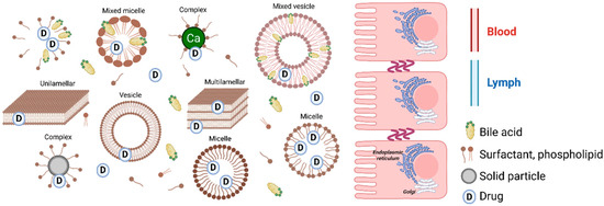 Micelles are isolated from the rest of the intestinal contents in a layer of unstirred water at the level of the intestinal mucosa and dissociated by the pH effect. The mechanism of dissociation of lipolysis products from mixed micelles is not yet fully elucidated, but it has been suggested that the process is associated with an acidic microenvironment present in the layer of unstirred water overlying the intestinal membrane. According to the microenvironment theory, ionized fatty acids are converted to their non-ionized forms and dissociate from the micelles before being rapidly absorbed across the intestinal membrane [31]. After enzymatic digestion, these lipids are taken up by enterocytes at the apical brush border by diffusion. Once absorbed, some fatty acids can move directly into the blood via diffusion, while others are recombined in the endoplasmic reticulum to form triglycerides. These triglycerides are then subsequently secreted into the circulation in the form of chylomicrons [32,33]. The particle size of the dispersion also plays an important role, with smaller colloidal structures able to diffuse more easily through the unstirred water layer and bring the active substance to the site of intestinal absorption. Given the complex interactions in the gastrointestinal tract, it seems that the properties of the dispersion formed after interaction with bile and pancreatic secretions, including particle size, condition the performance of LBFs rather than the particle size of the dispersion at the initial stage [17].