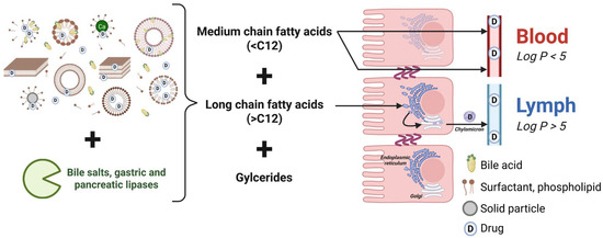 On the other hand, long-chain fatty acid esters can promote transport to the lymphatic circulation for highly lipophilic actives, thus bypassing the liver and reducing the first-pass effect and the metabolism for actives highly sensitive to this degradation pathway (Figure 4) [38,39]. This is one of the major advantages of lipid-based formulations. To achieve this, drugs are co-absorbed with long-chain fatty acids that associate with lipoproteins in chylomicrons, and the contents of these chylomicrons are then released directly into the lymphatic system [2]. Halofantrine has been used as a model drug to study lymphatic transport in the presence of lipids. By comparing short-, medium-, and long-chain fatty acid-based vehicles, the authors demonstrated that lymphatic absorption of halofantrine is significantly enhanced in formulations containing long-chain glycerides in cannulated rats [40]. Similar conclusions were observed in cannulated dogs, where 1 g of lipid-based formulations containing long-chain fatty acids also resulted in increased lymphatic uptake [41]. Although molecular weight does not appear to significantly influence lymphatic transport, the lipophilicity of a drug (expressed as log p) seems to impact its distribution between the blood and lymphatic system. According to several studies, lymphatic uptake from simple lipid formulations or oil solutions is minimal or absent for compounds with a log p < 5 [42]. Lymphatic transport is primarily evaluated using in vivo models, which remain the most established approaches. These include animals with cannulated lymphatic ducts or the administration of chylomicron secretion inhibitors such as cycloheximide [43]. However, such in vivo models are difficult to establish, and consequently, data on lymphatic transport remain limited. In contrast, in vitro methods to assess this absorption pathway are far less common. The lymphatic system is a complex biological network involving transport, resynthesis, assembly, and dissociation processes, which is difficult to replicate in vitro [32]. However, recent developments have introduced in vitro approaches based on artificial chylomicrons derived from Intralipid® emulsions combined with absorption assays. These emerging models offer a preliminary evaluation of both the lymphatic transport potential of active pharmaceutical ingredients and the influence of lipid-based excipients on this process [39].