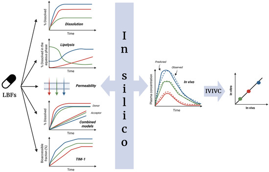 The notion of coupling two models is important because the data obtained during lipolysis and during permeation are linked and indispensable for establishing a strong correlation. Crum et al. were unable to correlate in vitro data using a pH-stat lipolysis model with in vivo data, but by combining in vitro lipolysis with in situ perfusion in an anesthetized rat, they were able to predict the in vivo performance observed in previously published studies [88]. Similarly, a study carried out on danazol and fenofibrate highlighted the lack of predictability of the data generated by lipolysis, but this lack of predictability was compensated by adding the permeation data generated during the experiment, which enabled the creation of a correlation with in vivo data [83]. This study also highlighted the in vitro behavior of LBFs, which differ according to the type of formulation chosen, with reference to LFCS [5]. Finally, work carried out on cinnarizine with this type of coupling also demonstrated the impact of lipolysis–permeation coupling compared with lipolysis alone on the prediction of in vivo performance [86].