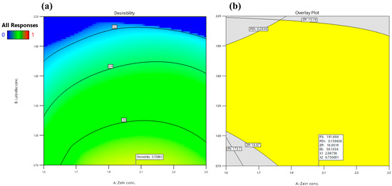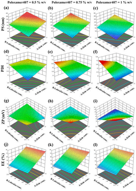As depicted in Figure 1a–c, an increase in zein concentration level (X1) positively impacted particle size (p < 0.0001), which can be explained by enhanced dispersion system viscosity with elevated zein concentrations. Increasing viscosity forms a barrier to the antisolvent precipitation mechanism, affecting the nucleation step’s efficiency in producing small particles [60]. Labrafac concentration (X2) positively influenced zein nanoparticle size (p = 0.0006), as a lipid vehicle entrapped in the nanoparticle matrix led to elevated core volume and enhanced particle size [62]. Lipid coexistence in nanoparticle matrix also increases viscosity, which may amplify aggregation by inhibiting nucleation [63]. Additionally, the hydrophobic nature of Labrafac may augment hydrophobic interaction with zein, contributing to particle fusion [64]. Otherwise, a negative relation with PS was disclosed regarding the effect of poloxamer concentration (X3) (p = 0.0006). Poloxamer 407 is an amphiphilic triblock copolymer that comprises polyethylene oxide (PEO) and polypropylene oxide (PPO) units, which add to its hydrophilic–lipophilic balance (HLB) [65]. At a concentration of 1% as reported by Elmowafy et al., the poloxamer hydrophobic block can be adsorbed entirely on the surface of the hydrophobic drug, and a steric barrier resulting from the PEO chain avoids aggregation and upholds size diminishment and stability [66].