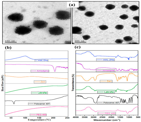 Thermal examination was implemented to display the thermograms of pure AML, zein, Poloxamer 407, Labrafac, PEG 400, and AML-ZNs using a differential scanning calorimeter (DSC, Shimadzu TA-60, Japan). The DSC instrument was calibrated using indium as a reference material to confirm enthalpy measurements. A constant nitrogen purge was maintained at a 50 mL/min flow rate to deliver an inert atmosphere and prevent sample oxidation. An amount equivalent to 5 mg of each sample was enclosed in an aluminum pan and scanned at a heat range from 25 to 250 °C at a scanning rate of 10 °C/min utilizing nitrogen gas as a purge [32].