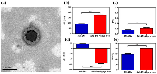 The final preparation after AML-ZNs were incorporated into the alginate coat and post-optimization of all eyedrop features were re-measured in terms of PS, PDI, ZP, and EE to investigate the applicability and suitability of the optimized AML-ZNs-Alg eyedrops.