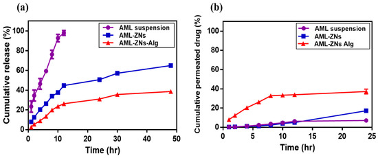 The ex vivo comparative assessment of AML from ZNs and ZNs-Alg systems to track permeation through corneal tissue was conducted using the modified USP dissolution tester apparatus type II, utilizing cow cornea for permeation experiments. The fresh cornea was fixed on one end of two side-opened tubes, and the other end was affixed to the shaft of the device. AML-ZNs, AML-ZNs-Alg system (equivalent to 8 mg), and 8 mg of drug suspension were placed inside the tube. Additionally, the permeation study medium consisted of 100 mL PBS (pH 7.4) containing 20% ethanol, kept at 37 ± 0.5 °C under constant mixing at 100 rpm for 24 h [47]. Two-milliliter aliquots were withdrawn from the medium at planned timepoints and substituted immediately with fresh medium. The collected samples were filtered (0.45 µm membrane) and analyzed employing a validated HPLC method. The cumulative amount of AML permeated from the investigated formulations was displayed versus the time used to evaluate the permeation rate. The permeation flux (Jss) parameter was also calculated.