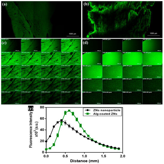 A small longitudinal section of the corneal tissue was inspected using a microscope (LSM 710; Carl Zeiss, Oberkochen, Germany). The FDA dye excitation wavelength was 488 nm, and the emission wavelength was 530 nm. Considering corneal layers, the observation yielded qualitative and quantitative data regarding the evaluated formulations. Optical scanning was conducted across a depth range of 0 µm to 150 µm, utilizing increments of 10 µm. The penetration attributes of the ZNs and ZNs-Alg systems within the corneal tissue were elucidated by fabricating a three-dimensional graphical illustration implementing a Z-stack model [50].
