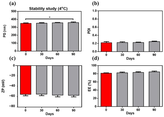 The optimum AML-ZNs-Alg formulation was stored at 4 ± 1 °C, in tightly sealed, amber-glass vials for 90 days to ascertain system stability during storage. PS, PDI, ZP, EE, viscosity, pH, and physical appearance were tracked to detect any agglomeration or changes in the formulation’s physicochemical stability. Measurements were taken for a freshly prepared sample, estimated as time zero, in addition to samples investigated at 30, 60, and 90 days. The evaluation was conducted in triplicate for all samples to ensure accurate results.
