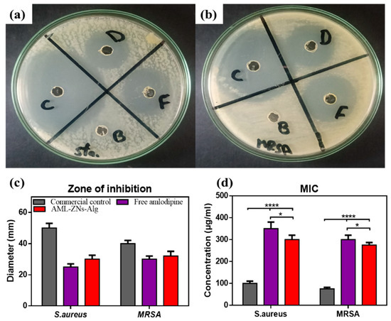 The broth dilution method, under the recommendation of the Clinical and Laboratory Standards Institute (CLSI) guideline, was employed to determine MIC concentration [53]. Successive two-times dilutions of all investigated formulations were prepared in sterile-capped universal bottles. A 2 mL volume of the overnight cultured strains was supplemented with 2 mL of each investigated sample dilution, followed by vortexing and 18 h of culturing at 37 °C. A prepared broth inoculated with the studied strains was used as a control to determine inhibition. The commercially available Optiflox® was used as a commercial control. Consequently, based on the growth turbidity, the MIC values were identified as the lowest concentration of each formulation inhibiting the growth of the adopted strains [54,55].