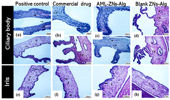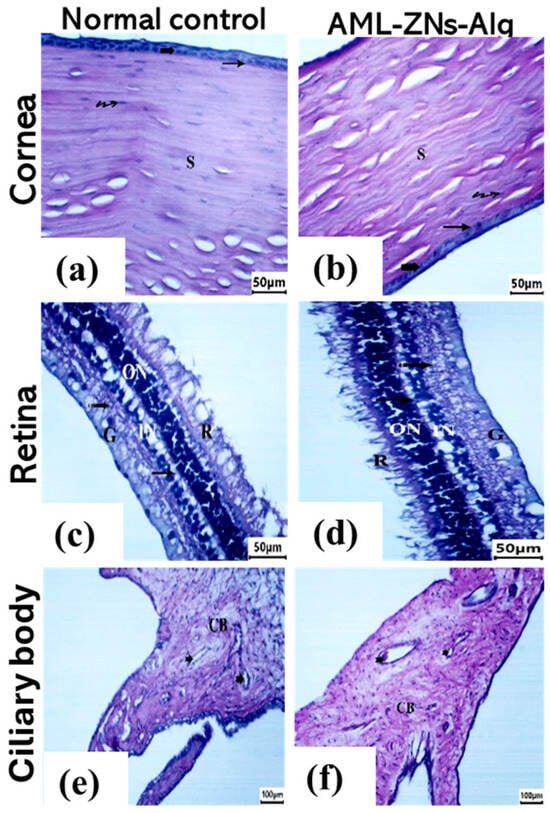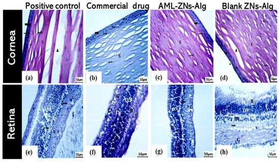 The histopathological analysis was performed on the whole rabbit eye, which was washed with normal saline, fixed in 10% buffered formalin for 24 h, rinsed, dehydrated, trimmed, and embedded in paraffin. Tissue specimens of 5 µm-thick sections were affixed to glass slides [50]. The acquired tissue sections were deparaffinized using xylol and stained using hematoxylin and eosin (H&E) for histopathological evaluation through the electric light microscope [57].