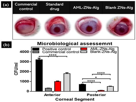 All rabbits were anesthetized for the induction of MRSA keratitis, followed by ocular washing. A 100 μL volume of 2.6 × 105 CFU/mL of MRSA strain was injected into the corneal stroma. The rabbits’ eyes were monitored daily until signs of MRSA keratitis occurred. A parallel design of four groups, each having two randomly selected rabbits (total = 8 rabbits, n = 2), was implemented. Group I was assigned to the infected eye with no treatment (positive control). Group II was treated with a dose of the commercial antibacterial drug (Optiflox®) 4 times daily. Group III was assigned to the AML-ZNs-Alg eyedrops with one dose every 24 h. Group IV was assigned to the blank ZNs-Alg formulation. The allocated therapies were applied daily, and treatment was continued for 7 days after the induction of bacterial keratitis. The conjunctival congestion, redness, mucopurulent discharge, chemosis, corneal infiltrate, and corneal edema were evaluated as indicators of bacterial keratitis. After 7 days of treatment, rabbits were humanely sacrificed by decapitation using phenobarbital sodium injection for anesthesia in the marginal vein. Eye specimens were gathered from the investigated groups, considering the left eye for microbiological and the right eye for histopathological assessment. For the microbial assessment, homogenized corneal samples were cultured in mannitol salt agar (MSA) for 24 h at 37 °C, followed by colony-forming unit (CFU) enumeration [56].