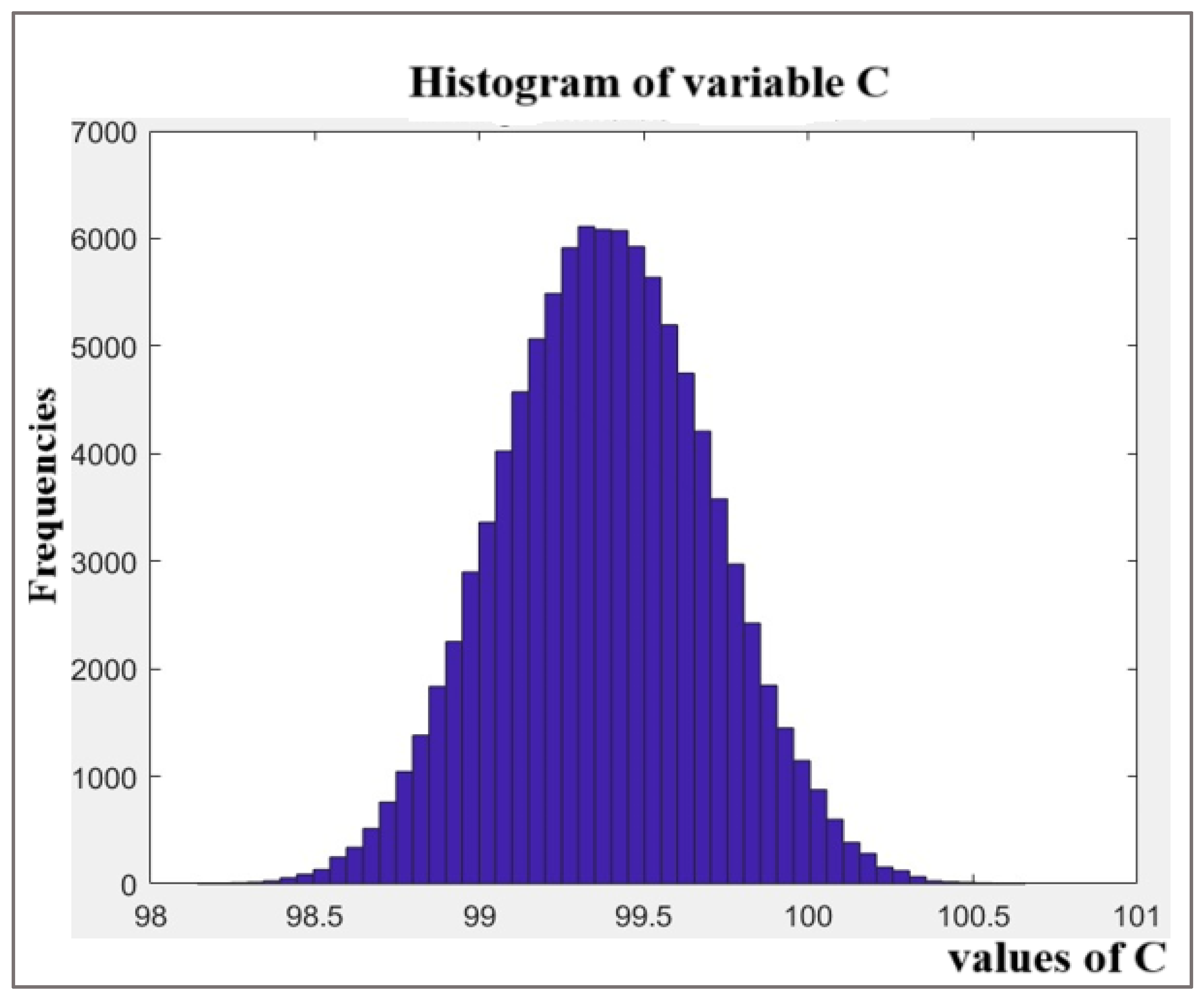 Figure 6. The distribution is effectively symmetric and approximately normal, which justifies the use of a symmetric coverage interval. It reflects the precise shape of the output distribution and the large number of effective degrees of freedom resulting from combining the input uncertainties. The 95% coverage interval derived from the simulation is narrower and more precise than the one obtained from the GUM approach, yielding an expanded uncertainty of ±0.62% compared to ±0.69%. This demonstrates the MCS’s ability to provide a more refined uncertainty estimate for this model.