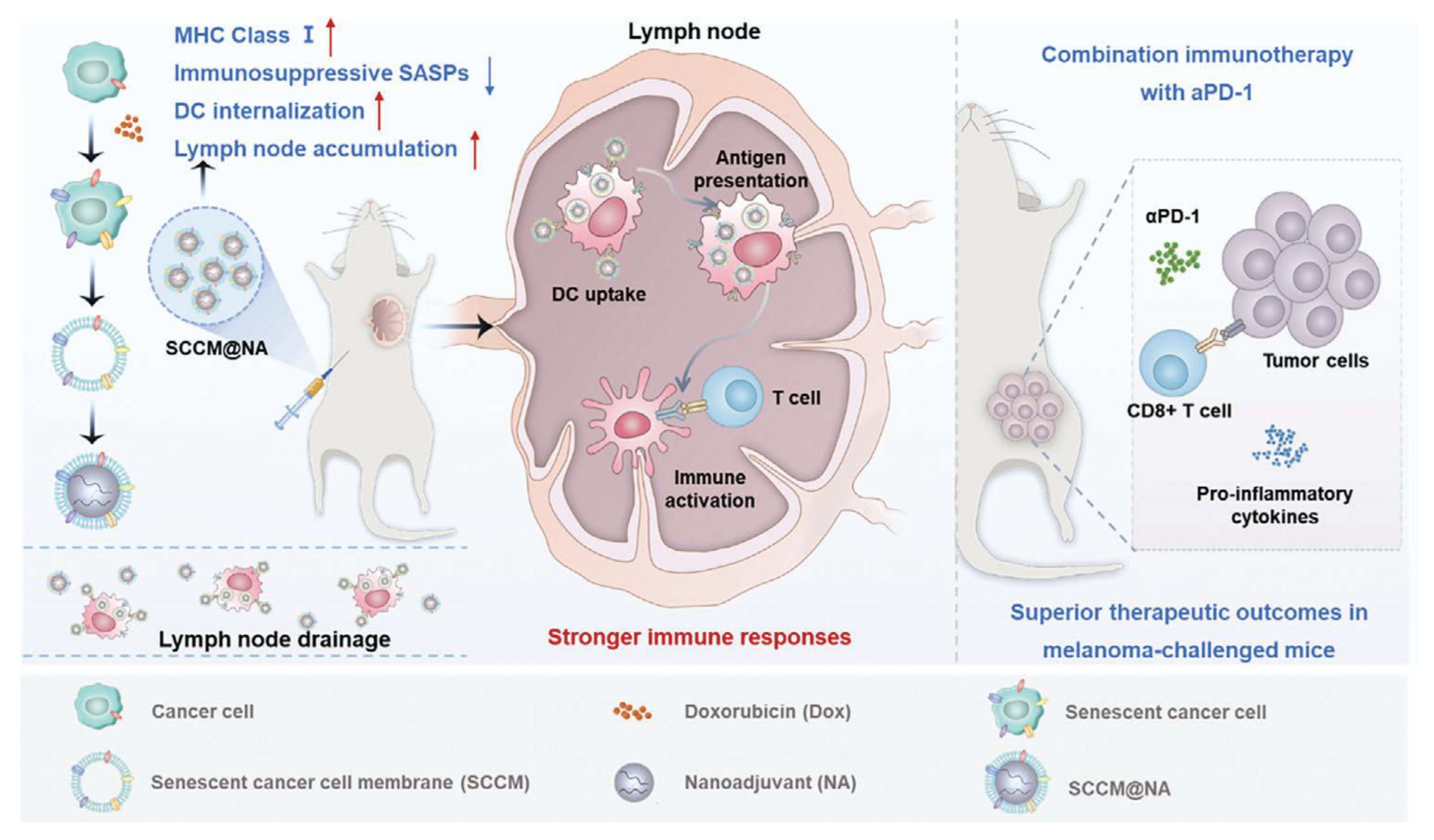 B16-F10 (melanoma, mouse) | SCCM@NA (Senescent cancer cell membrane-coated on CpG-loaded Mesoporous Silica Nanoadjuvant) | Sonication & Extrusion | Enhanced DC internalization, improved lymph node targeting, robust CD8+ T cell activation, strong antitumor immunity, synergy with αPD-1, suppression of metastasis | 2024 | [37] |