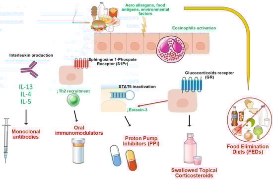 - Barchi, A.; Mandarino, F.V.; Yacoub, M.-R.; Albarello, L.; Massimino, L.; Savarino, E.V.; Ungaro, F.; Passaretti, S.; Masclee, G.M.C.; Danese, S.; et al. From Pathogenesis to Treatment: Targeting Type-2 Inflammation in Eosinophilic Esophagitis. Biomolecules 2024, 14, 1080. [Google Scholar] [CrossRef]