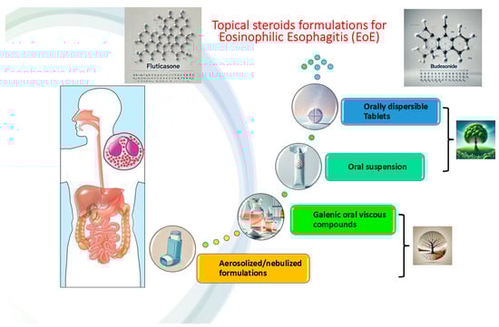 Eosinophilic esophagitis (EoE) is a chronic immune-mediated disease of the esophagus [,]. It is characterized by eosinophilic infiltration of the esophageal mucosa, leading to the development of obstructive symptoms [], after having ruled out other possible causes of eosinophilic infiltration of the esophagus []. EoE incidence and prevalence have been steadily increasing in the last 20 years, especially in Europe and North America []. Recently, its prevalence has been estimated to be around 40.1 per 100,000 inhabitants-years and 5.3 new cases per 100,000 inhabitants per year []. There is a male-to-female ratio of 3:1, with a higher incidence in adults compared to children []. The typical age of onset is around 25–35 years old []. EoE leads to esophageal remodeling with lumen narrowing and stenosis development, if untreated []. EoE symptoms are obstructive in the adult population (mainly dysphagia and food impaction) while poor appetite, abdominal pain, vomiting, and heartburn/regurgitation are more common in the pediatric population []. Furthermore, the chronic nature of the disease might negatively impact patients’ quality of life, causing social isolation, lifestyle adjustments, food avoidance, and compensatory behaviors []. The gold standard for the diagnosis remains upper endoscopy (EGD) with biopsy sampling from different sites of the esophagus, being EoE a patchy disease []. According to current guidelines, at least six samples should be collected from at least two esophageal regions [], with ≥15 eosinophils per high-power field (HPF) of peak eosinophil count (PEC) as the histologic cut-off for the diagnosis []. The treatment landscape in EoE is rapidly evolving: (a) Proton Pump Inhibitors (PPIs) remain widely used as off-label drugs, with efficacy rates >50% in recent meta-analysis even after dose-escalation [,]. Even though they are of limited efficacy eosinophilic infiltration is high, and are burdened by high rates of discontinuation or withdrawal rates [], they seem effective especially in selected EoE phenotypes (inflammatory profile with prevalent distal esophageal eosinophilia []) at twice daily dose []; (b) elimination diets (1-, 4-, 6-foods or elemental diets) appear to be effective [], even for less stringent approaches [], but are burdensome for patients and it is difficult to select potential responders []; (c) biological treatments are on the pipeline, leaded by dupilumab, already proven as the most effective therapy, especially for refractory cases [], while several other monoclonal antibodies are being investigated, with several different targets (IL-4, IL-5, IL-13, IL-15, and Siglec-8 pathways) [,,] and even immunomodulators have shown anti-eosinophil promising effects []. For fibrostenotic disease, esophageal mechanical or hydraulic dilation represents a fundamental additional therapeutic option []. Nonetheless, swallowed topical corticosteroids (STCs), fluticasone and budesonide above all, still represent the cornerstone of EoE treatment []. For years, STCs have been used in formulations and dosages borrowed from other settings and used off-label, which raises several issues regarding adherence and patient compliance []. Recently, novel formulations and compounds have been developed, completely re-shaping EoE treatment and the natural history of the disease (Figure 1) []. Despite that, several unmet needs remain unaddressed in EoE management, particularly regarding treatment adherence, drug formulations, and strategies for long-term disease control. This situation posed economic, logistical, and acceptability barriers, which negatively impact therapeutic adherence. Moreover, most patients tend to relapse after therapy discontinuation, highlighting the need for safe and effective long-term maintenance strategies. The recent introduction of targeted formulations (e.g., orally dispersible tablets or ready-to-use suspensions, already approved in several countries) as well as specific biologic therapies has helped to overcome some of these obstacles; however, issues remain regarding ease of administration, insurance coverage/reimbursement, long-term safety evidence, and personalized strategies to improve adherence and sustain remission []. The aim of this comprehensive review was to exploit the change in paradigm that the novel formulations of STCs have brought to the EoE treatment landscape by conducting an extensive review of the literature alongside a detailed comparative analysis of pharmacokinetic properties.