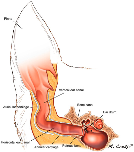 A schematic diagram of the canine ear. Reprint with permission from [18]; copyright permission license provided by Springer Nature and Copyright Clearance Center 2024.