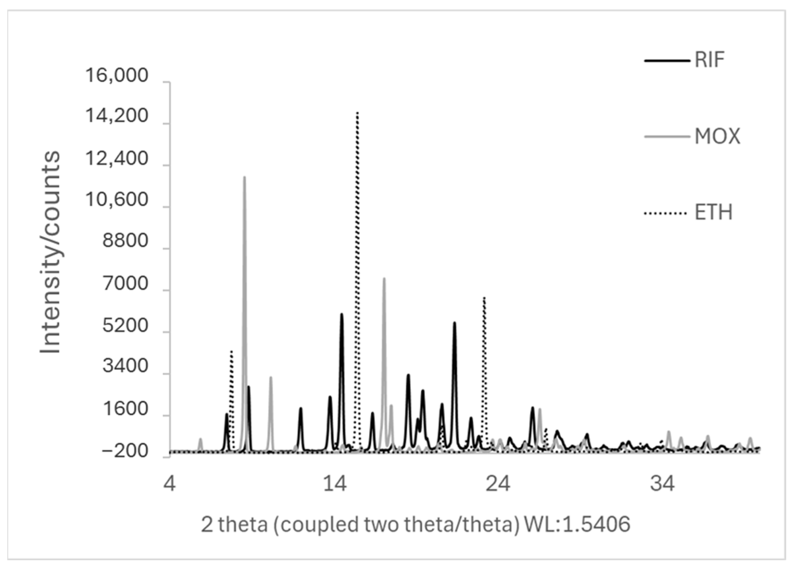 XRD pattern of the starting materials (jet-milled RIF, ETH, and MOX).