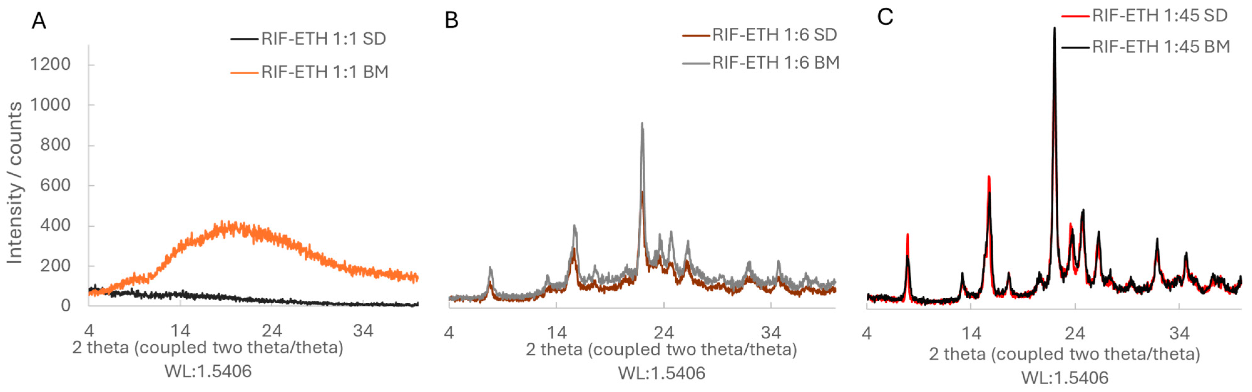 XRD patterns of the different RIF-ETH formulations: (A) spray-dried (SD) and ball-milled (BM) in a molar ratio of 1:1; (B) SD and BM in a molar ratio of 1:6; (C) SD and BM in a molar ratio of 1:45.