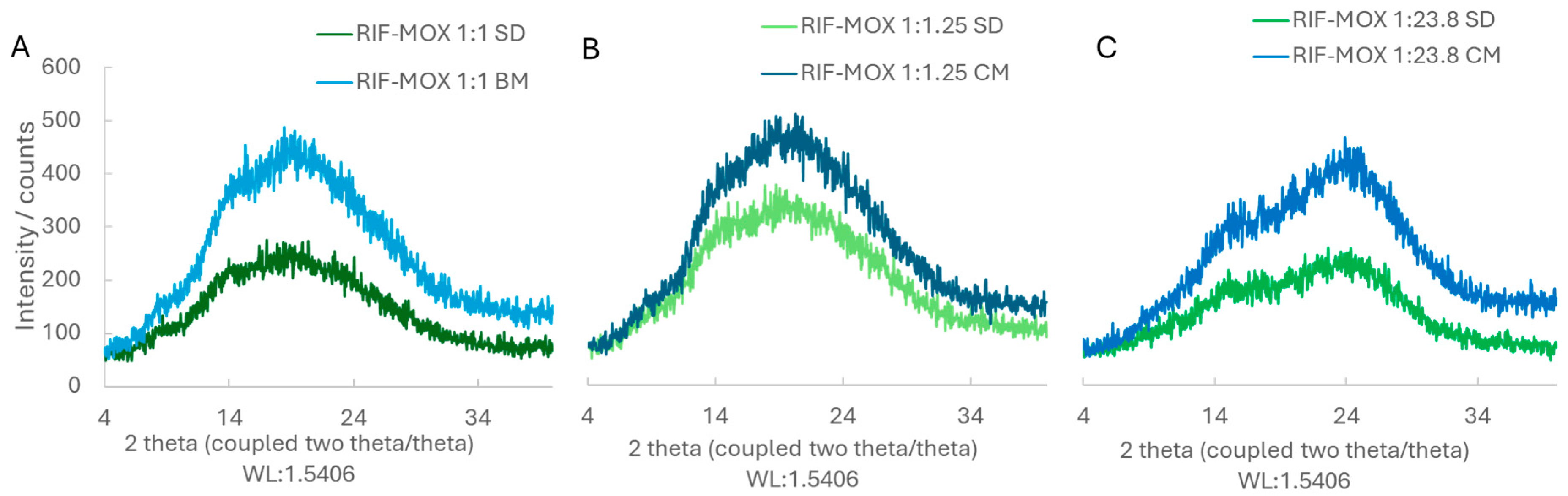XRD patterns of the different RIF-MOX formulations: (A) spray-dried (SD) and ball-milled (BM) in a molar ratio of 1:1; (B) SD and BM in a molar ratio of 1:1.25; (C) SD and BM in a molar ratio of 1:23.8.