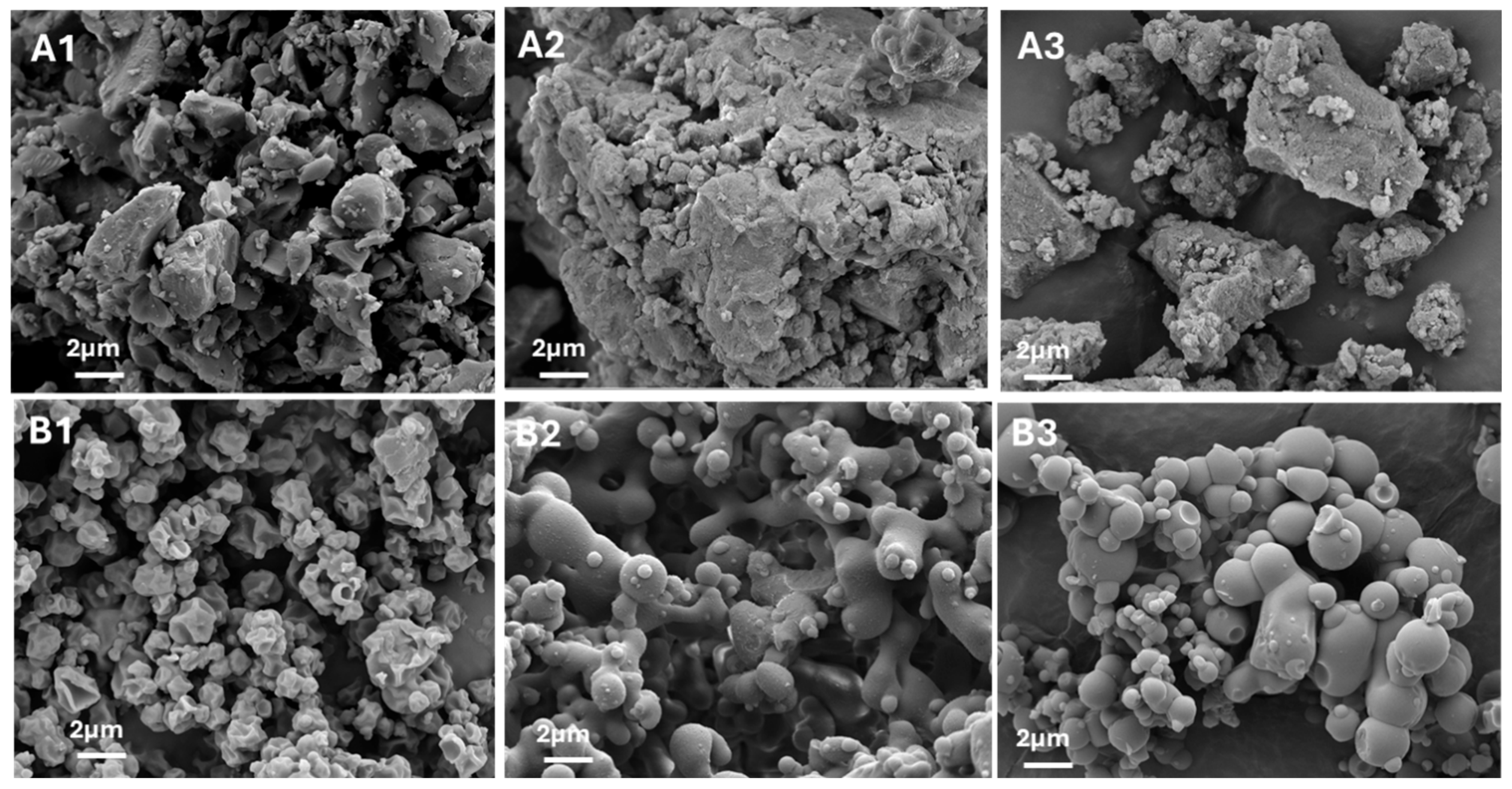 SEM images of RIF-ETH formulations in different molar ratios and prepared via milling (BM) or spray drying (SD): (A1) RIF-ETH 1:1 BM, (B1) RIF-ETH 1:1 SD, (A2) RIF-ETH 1:6 BM, (B2) RIF-ETH 1:6 SD, (A3) RIF-ETH 1:45 BM, and (B3) RIF-ETH 1:45 SD (image width 22.87 µm).