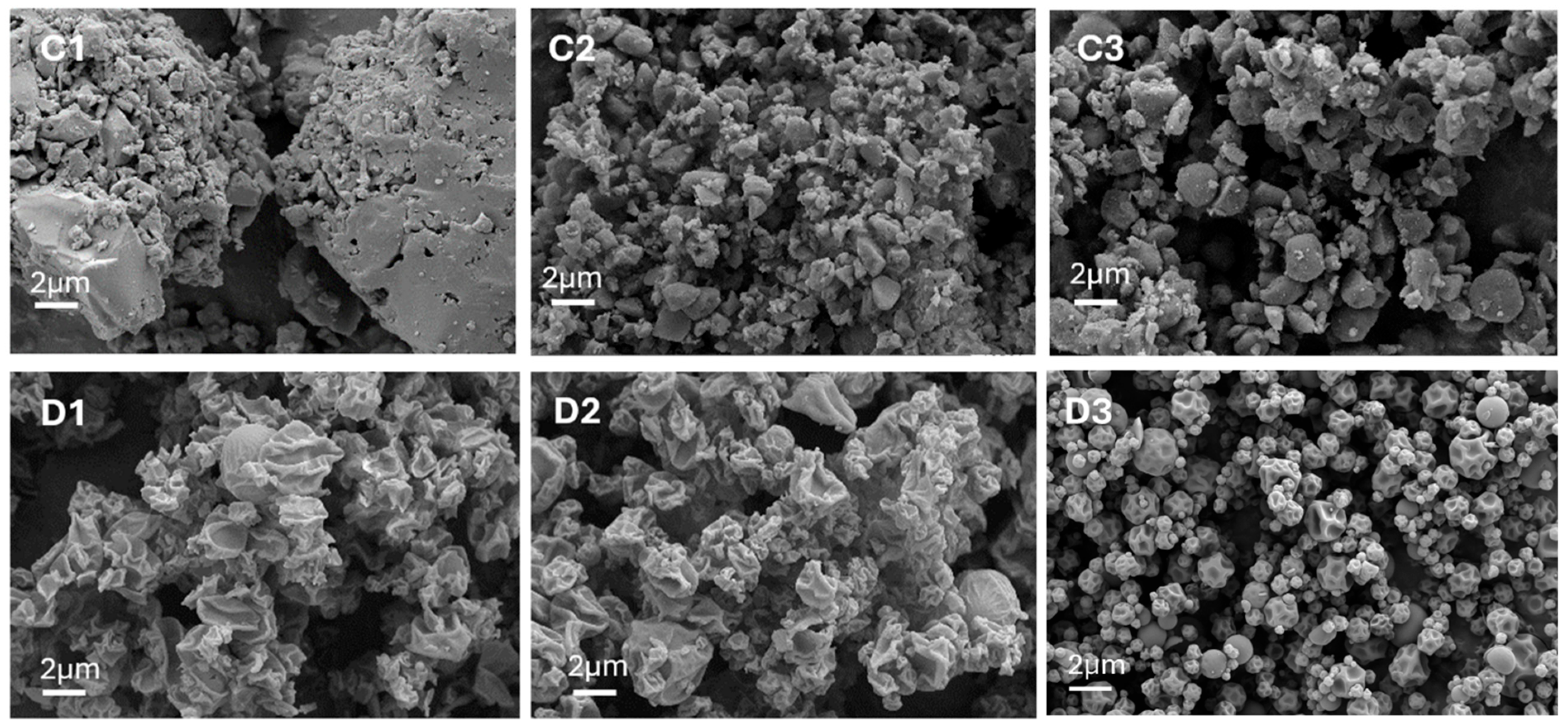 SEM images of RIF-MOX formulations in different molar ratios and prepared via ball milling (BM), co-milling (CM), or spray drying (SD): (C1) RIF-MOX 1:1 BM, (D1) RIF-MOX 1:1 SD, (C2) RIF-MOX 1:1.25 CM, (D2) RIF-MOX 1:1.25 SD, (C3) RIF-MOX 1:23.8 CM, and (D3) RIF-MOX 1:23.8 SD (image width 22.87 µm).