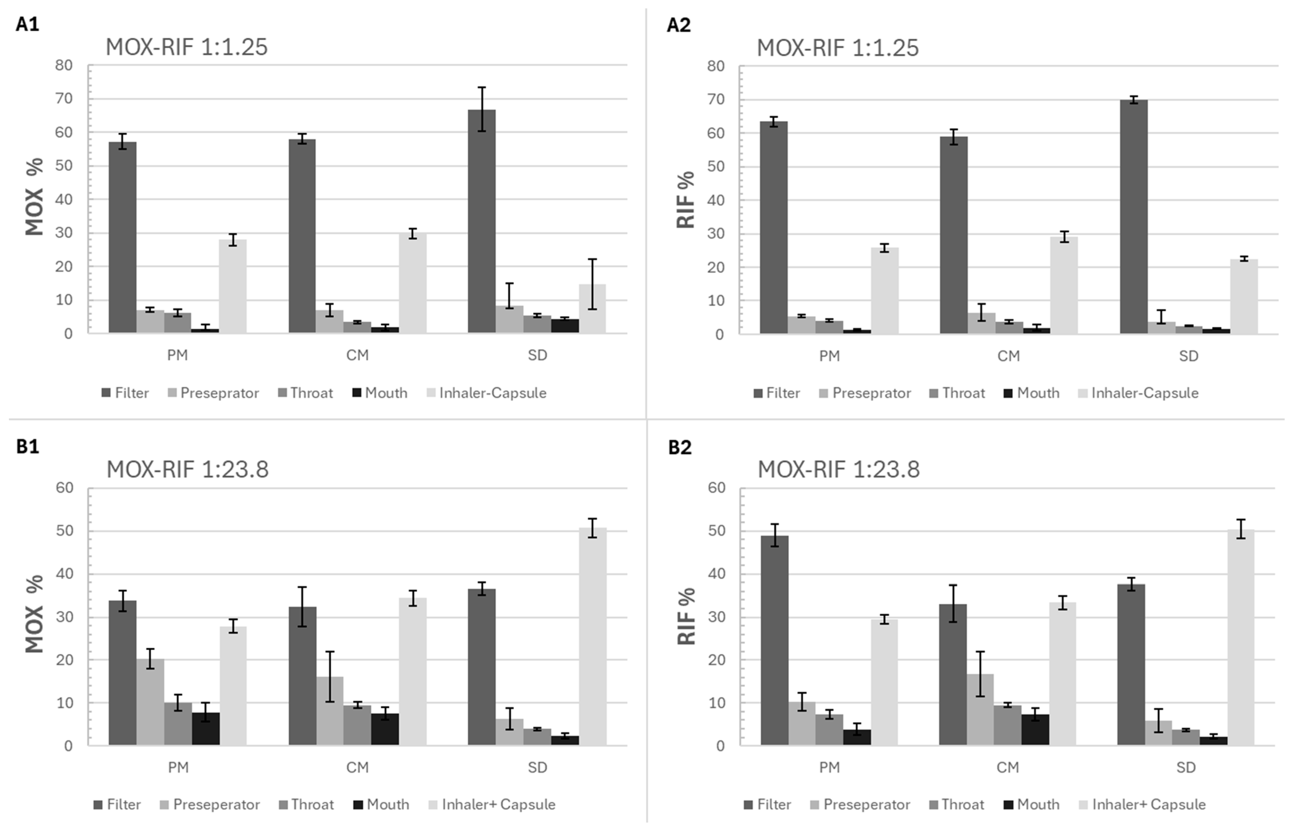 Percentage of RIF and MOX depositions in each stage of FSI (filter, preparator, throat, mouth, and inhaler + capsule) for the physical mixture (PM), spray-drying (SD), and co-milling (CM) formulations of 2 molar ratios (1:1.25 and 1:23.8), (A1) MOX percentage for the 1:1.25 formulations, (A2) RIF percentage for the 1:1.25 formulations, (B1) MOX percentage for the 1:23.8 formulations, (B2) RIF percentage for the 1:23.8 formulations, mean ± SD, n = 3.