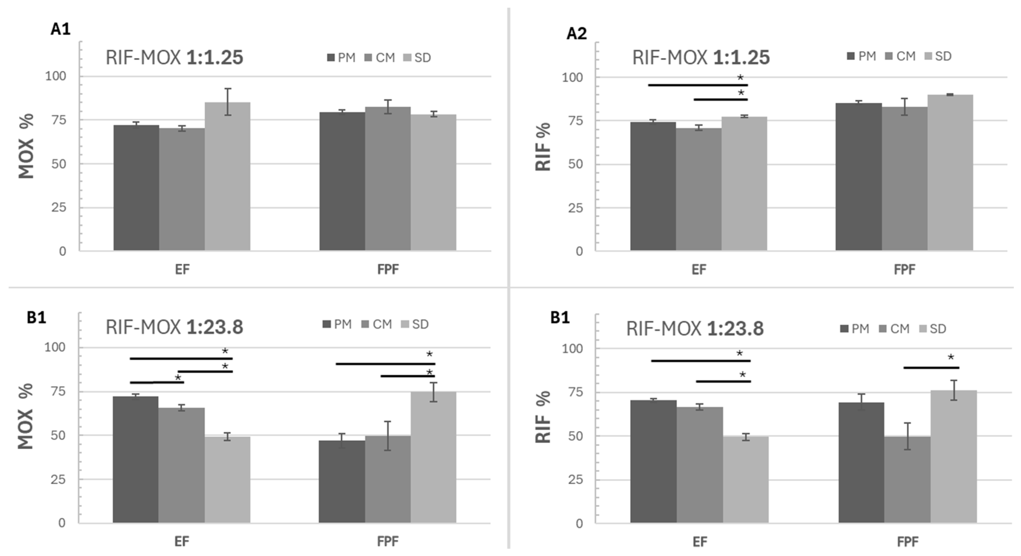 | RIF-MOX 1:1.25 PM | 71.9 ± 1.7 | 5.1 ± 0.4 | 79.5 ± 1.4 | 74.2 ± 1.2 | 9.2 ± 0.5 | 85.4 ± 1.1 |