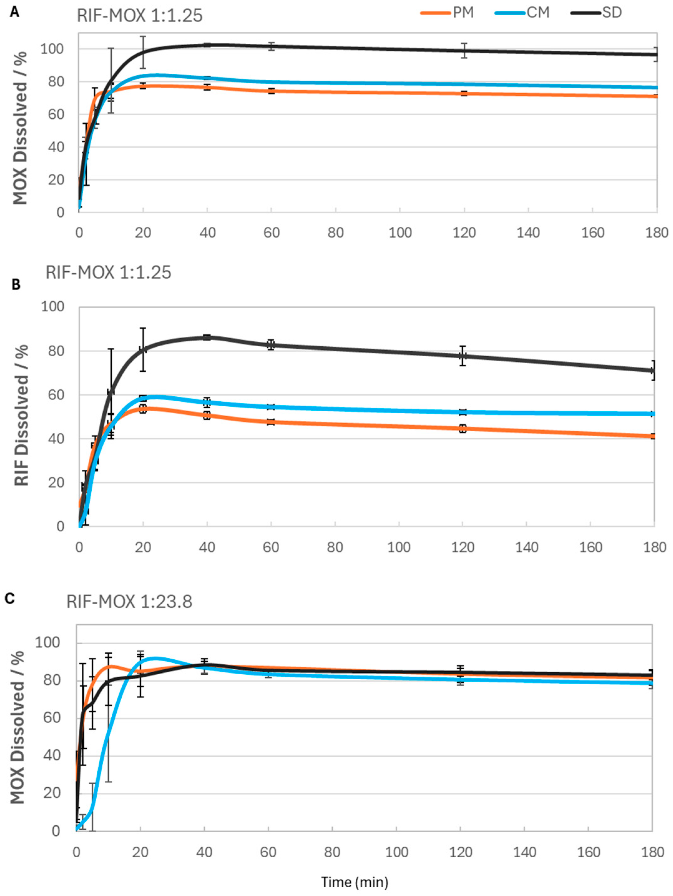 RIF-MOX formulation dissolution profiles over time for both RIF and MOX: (A) MOX dissolved for RIF-MOX 1:1.25, (B) RIF dissolved for RIF-MOX 1:1.25, and (C) MOX dissolved for RIF-MOX 1:23.8; mean ± SD, n = 3.