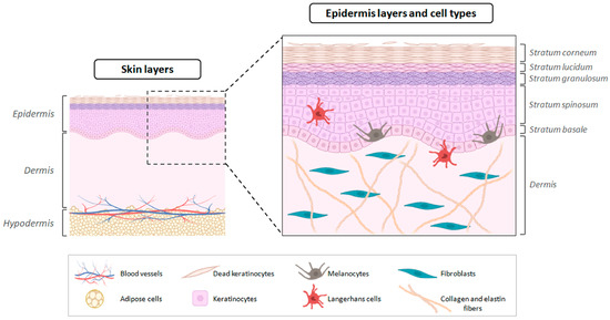 Skin exhibits an intricate structure and is composed of two fundamental layers, the dermis and the epidermis. The epidermis, the outermost layer, is a non-vascularized stratified epithelium, predominantly made up of ectoderm-derived keratinocytes, that undergoes continuous cell renewal [2]. These cells play a crucial role in the defence functions of the skin, controlling inflammation through the release of pro-inflammatory cytokines essential for modulating skin irritation and sensitisation [3,4]. Additionally, the appendages (hair follicles, sebaceous glands, and sweat glands) are located in this layer. Moreover, the keratinisation process, which involves cell differentiation into several layers (basal layer, stratum spinosum, stratum granulosum, stratum lucidum, and stratum corneum), is crucial in constituting an essential barrier against the penetration of chemical substances and microorganisms [2,5]. The dermis is connected to the epidermis through the basement membrane, constituting connective tissue. This stratum contains sweat glands, hair follicles, muscles, sensory neurons, and blood vessels, with fibroblasts being the main cell type identified [2,6] (Figure 1).