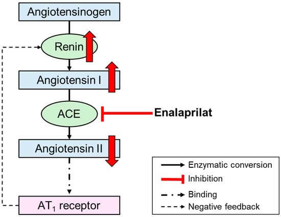 Schematic diagram of the renin–angiotensin–aldosterone system and illustration of the effects of enalaprilat on renin, angiotensin I, and angiotensin II. The red arrows indicate the changes in pharmacodynamic parameters caused by the inhibition of angiotensin-converting enzyme by enalaprilat. Angiotensin II decreases, leading to reduced negative feedback on renin secretion. This results in an increase in renin, which in turn leads to an increase in angiotensin I. ACE, angiotensin-converting enzyme; AT1 receptor, angiotensin II type 1 receptor.