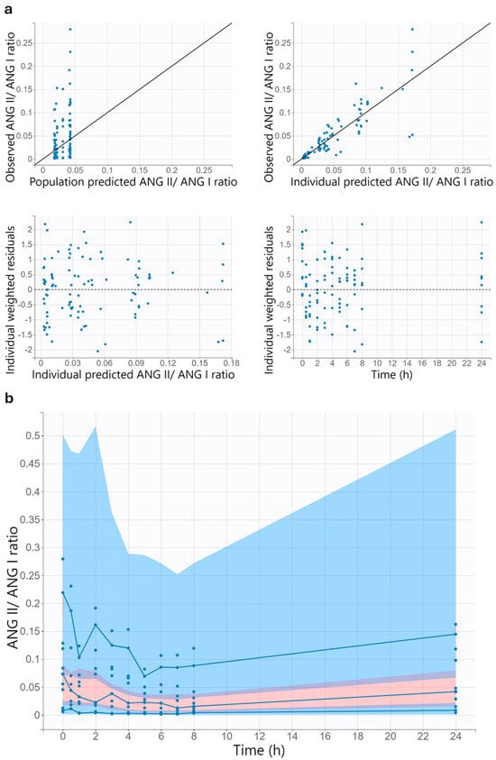 Goodness-of-fit plots (a) and visual predictive check (b) for the final pharmacodynamic model for the children with heart failure. All concentrations mentioned in the figure refer to the enalaprilat concentration. In all diagrams, the blue dots indicate the observed data. In the two upper diagrams in (a), the solid black line is the line of unity. In the two lower diagrams in (a), the dashed black line represents the theoretical mean. In the visual predictive check (b), the solid blue lines with blue dots are the 10th, 50th, and 90th percentiles of the observed data. The shaded areas represent the 90% prediction intervals of the 10th (blue), 50th (pink), and 90th (blue) percentiles of the simulated data. The purple areas are the areas where the 90% prediction interval of the 50th percentile of the simulated data overlaps with the 90% prediction interval of the 10th or 90th percentile of the simulated data. Red areas indicate the areas where the empirical percentile lies outside the prediction interval. ANG I, angiotensin I; ANG II, angiotensin II.