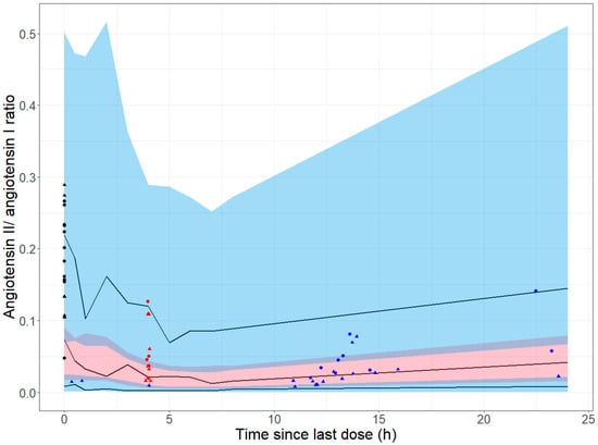 To compare the time course of the angiotensin II/angiotensin I ratio after enalapril administration in healthy adults and children with heart failure, the corresponding visual predictive check of the final pharmacokinetic/pharmacodynamic model for healthy adults was used. The observed data from children with heart failure were added to the visual predictive check. In contrast to the adult data, data were also available for children with heart failure after repeated administration of enalapril. For this data, the time since the last dose was calculated. If the angiotensin II value was below the LLOQ, the angiotensin II value was replaced by LLOQ/2 before calculating the angiotensin II/angiotensin I ratio. Observations in which both angiotensin I and angiotensin II were below the LLOQ were excluded.