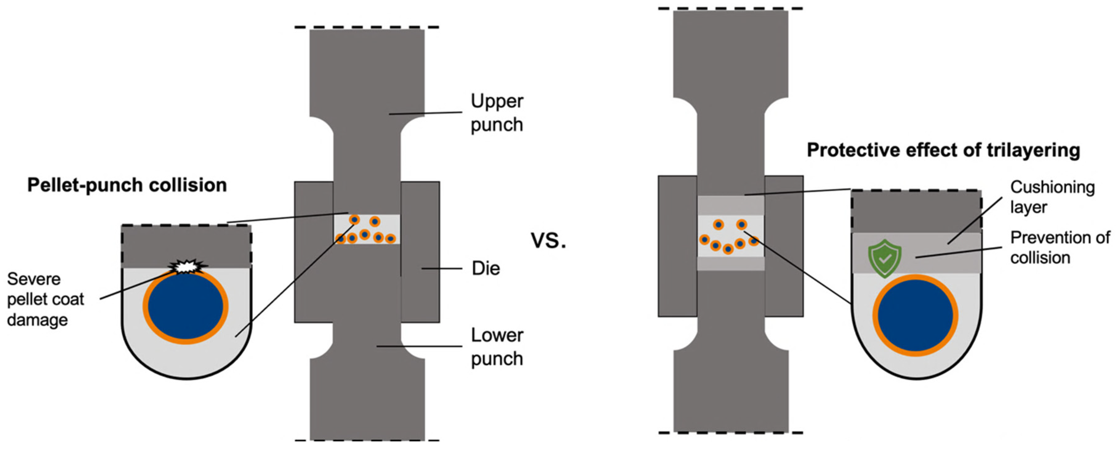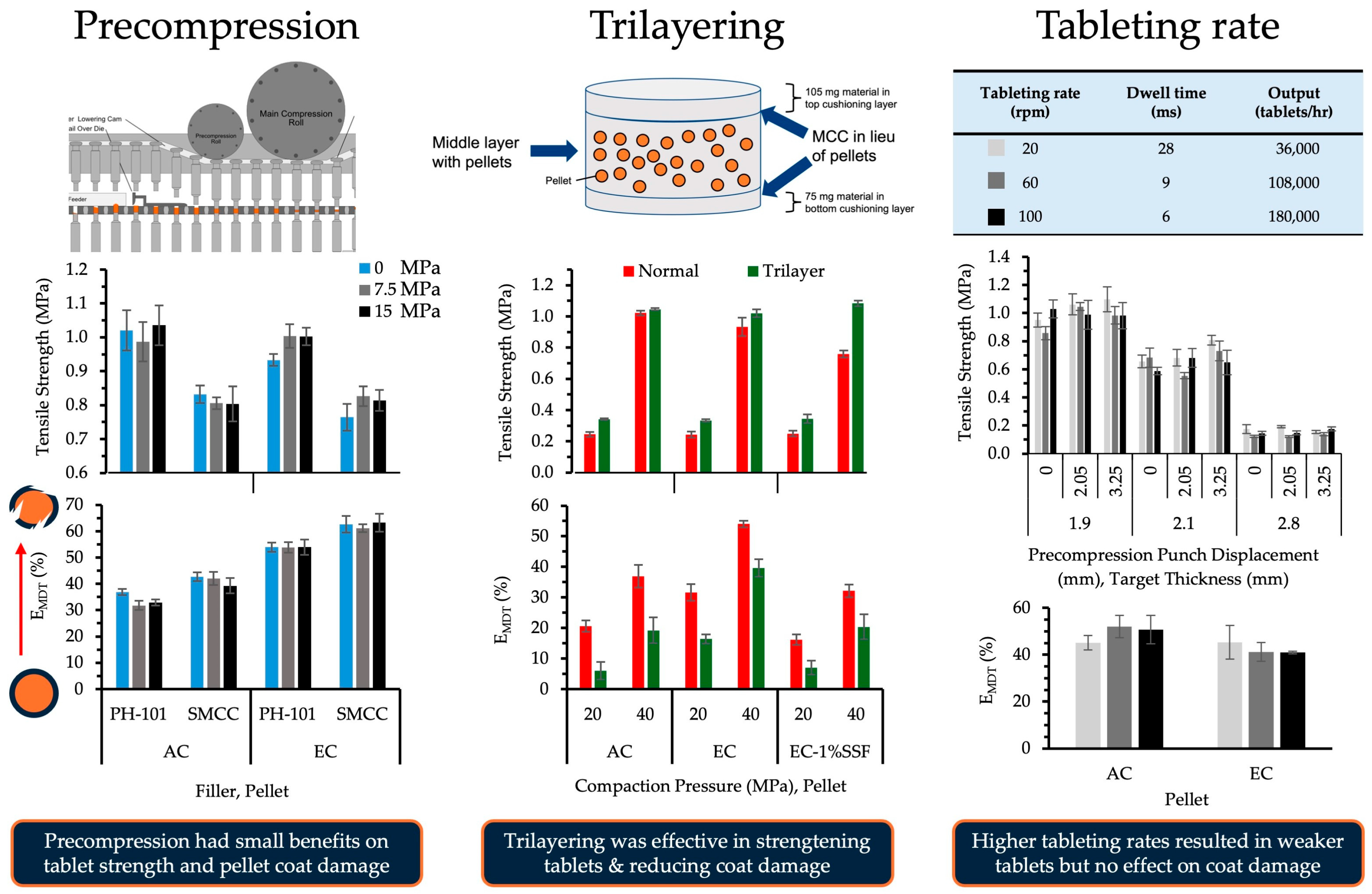 - Xu, M.; Heng, P.W.S.; Liew, C.V. Formulation and Process Strategies to Minimize Coat Damage for Compaction of Coated Pellets in a Rotary Tablet Press: A Mechanistic View. Int. J. Pharm. 2016, 499, 29–37. [Google Scholar] [CrossRef]