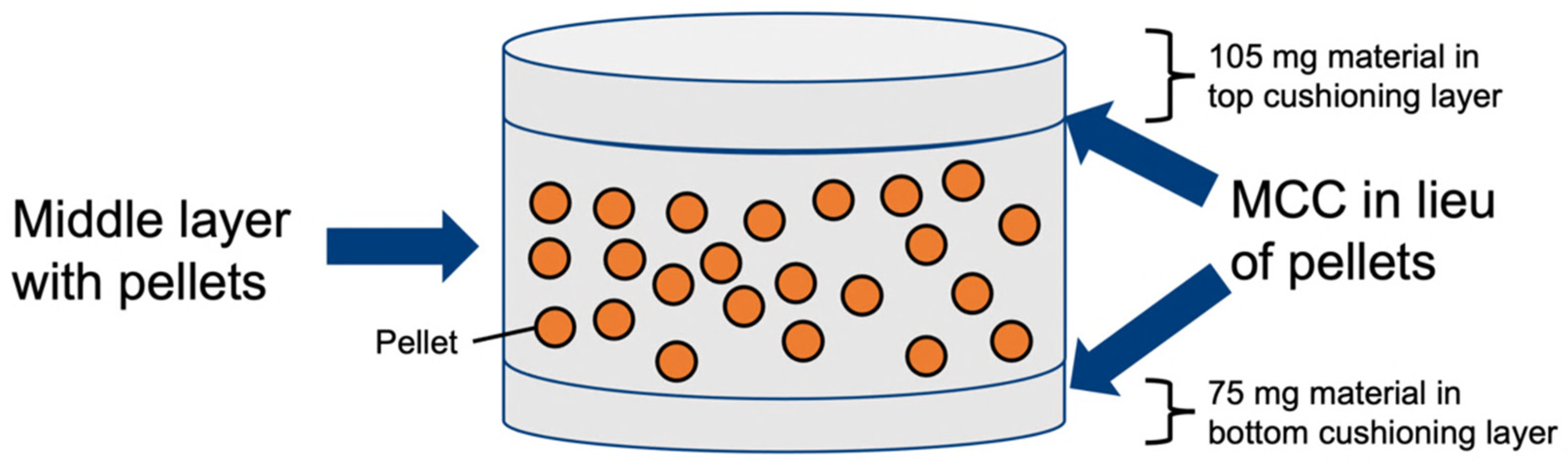 | Component | MCC Tablets (%, w/w) | SMCC Tablets (%, w/w) | Cushioning Layer (%, w/w) |