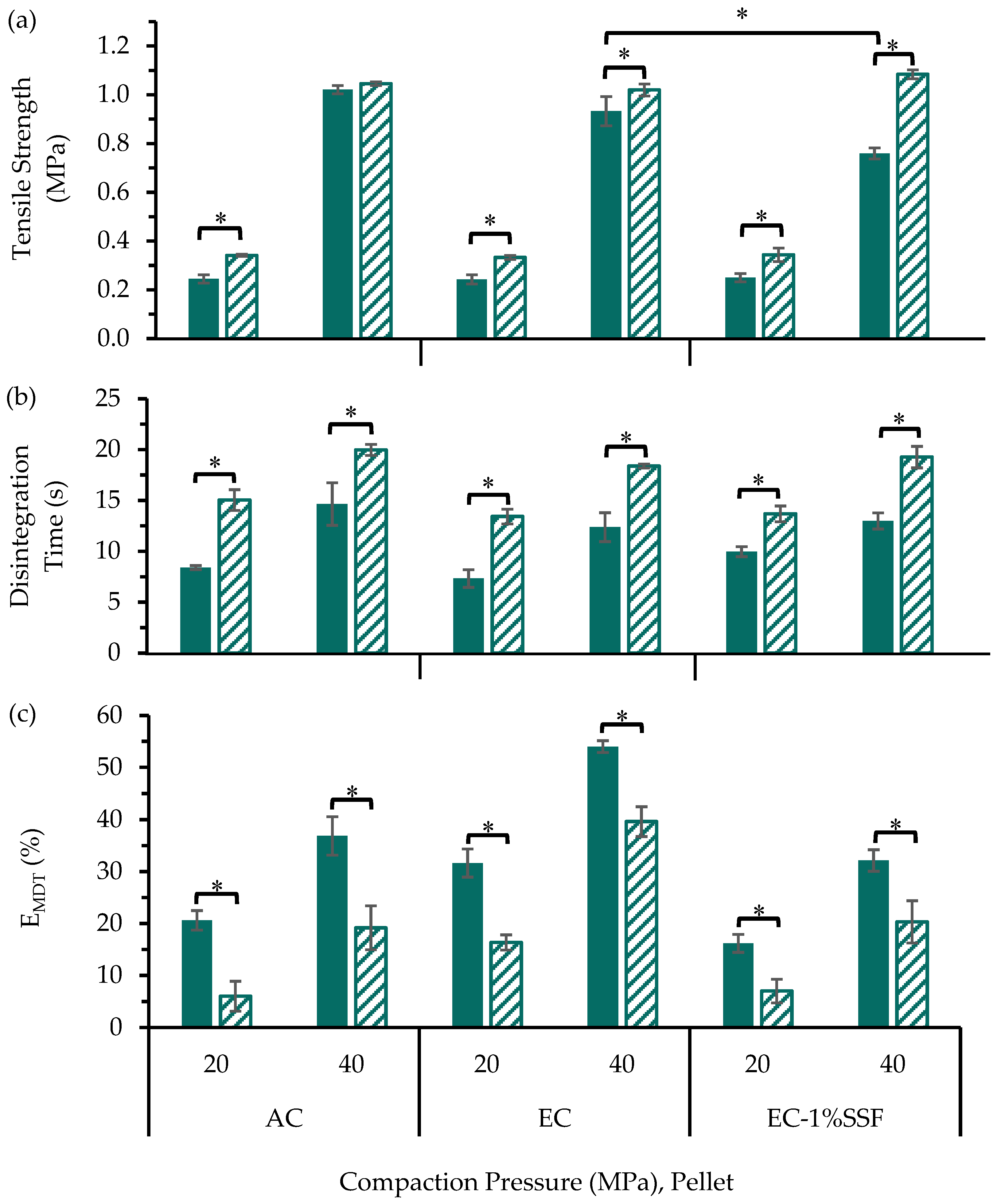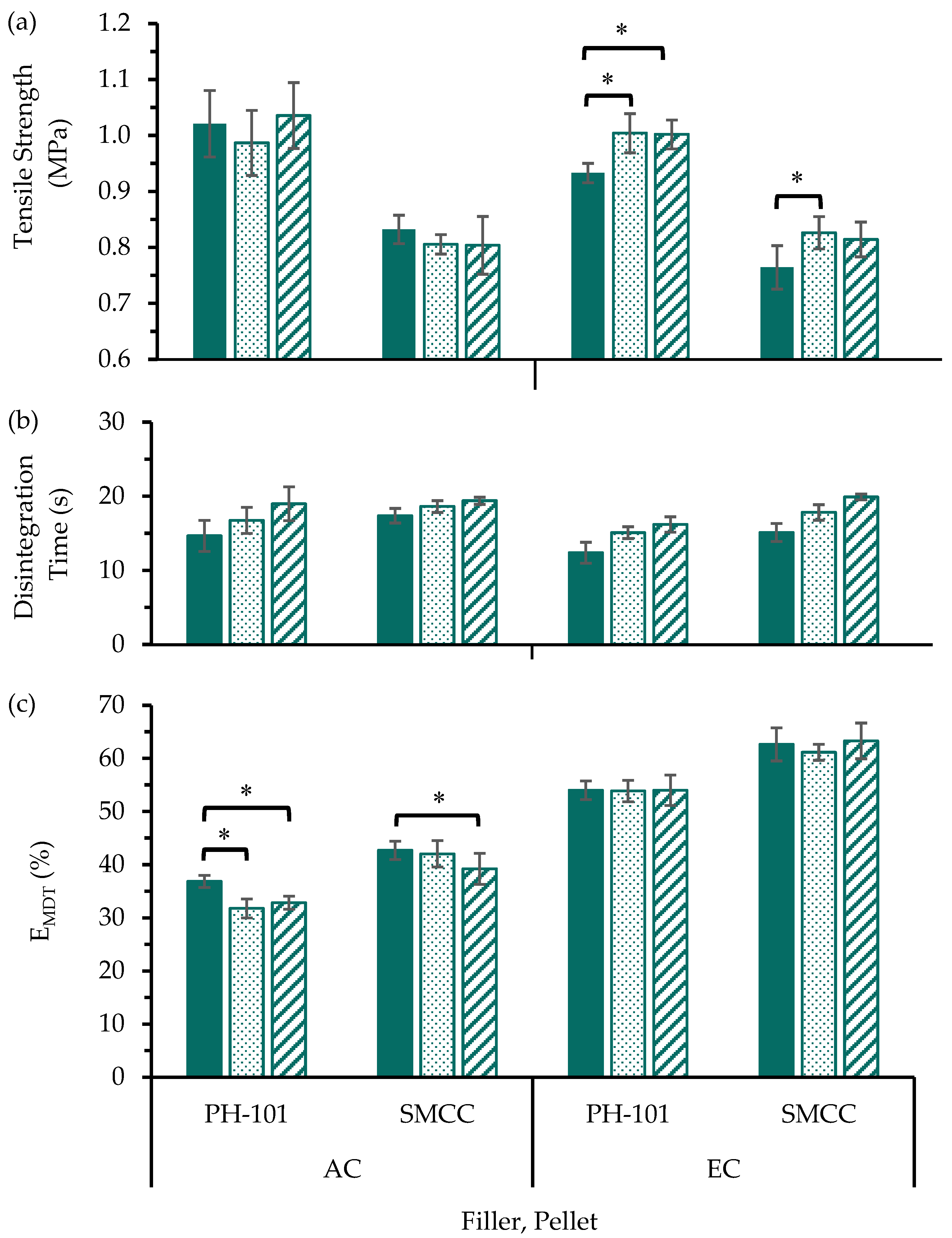 ) MUPS tablets. Significant differences are denoted by * and some are omitted for visual clarity. PH-101 was used in the filler material.
