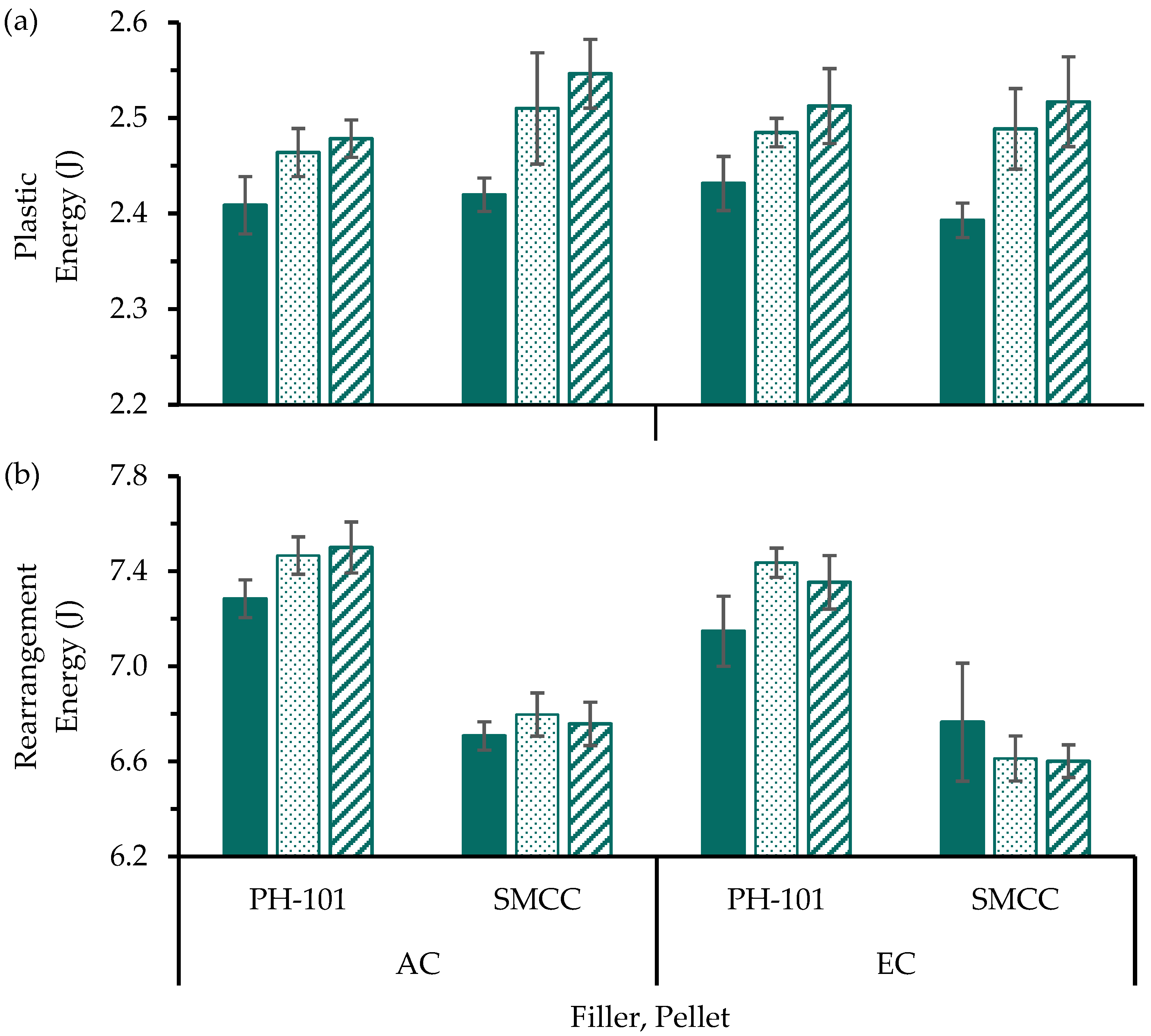 ) rpm to a target thickness of 2.1 mm without precompression. Significant differences are omitted for visual clarity. PH-101 was used in the filler material.