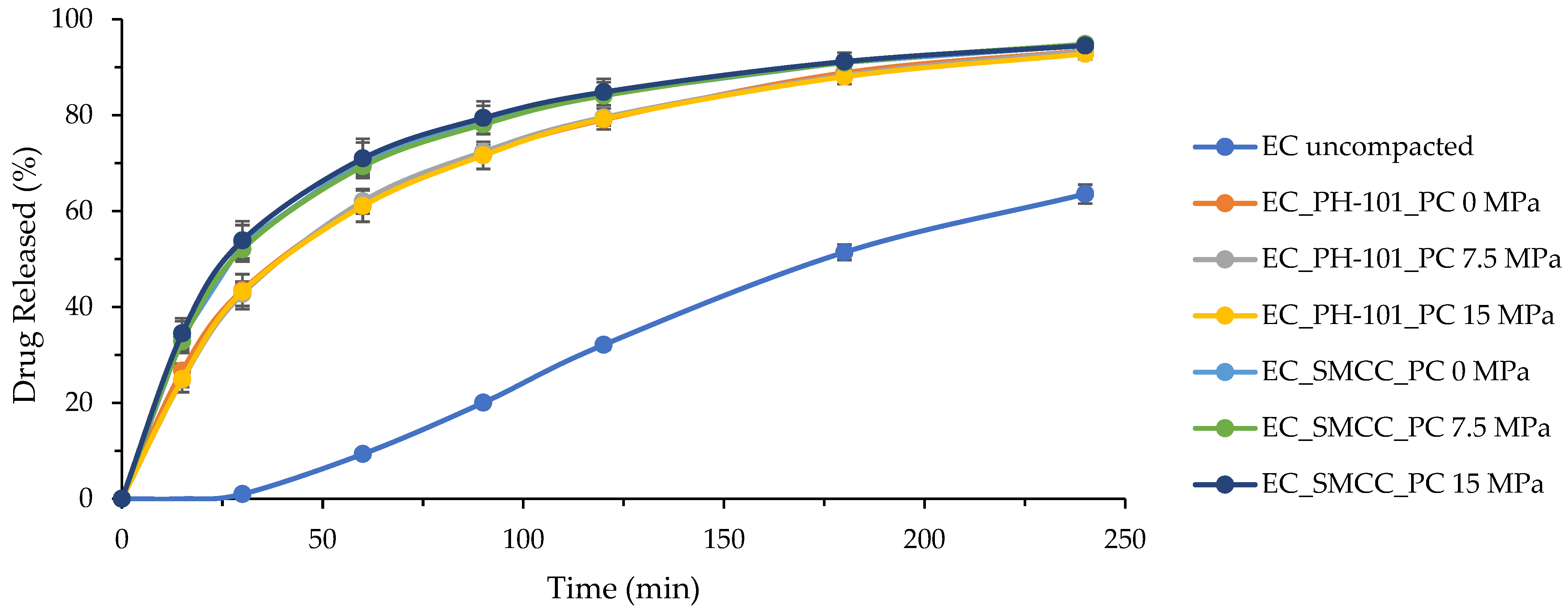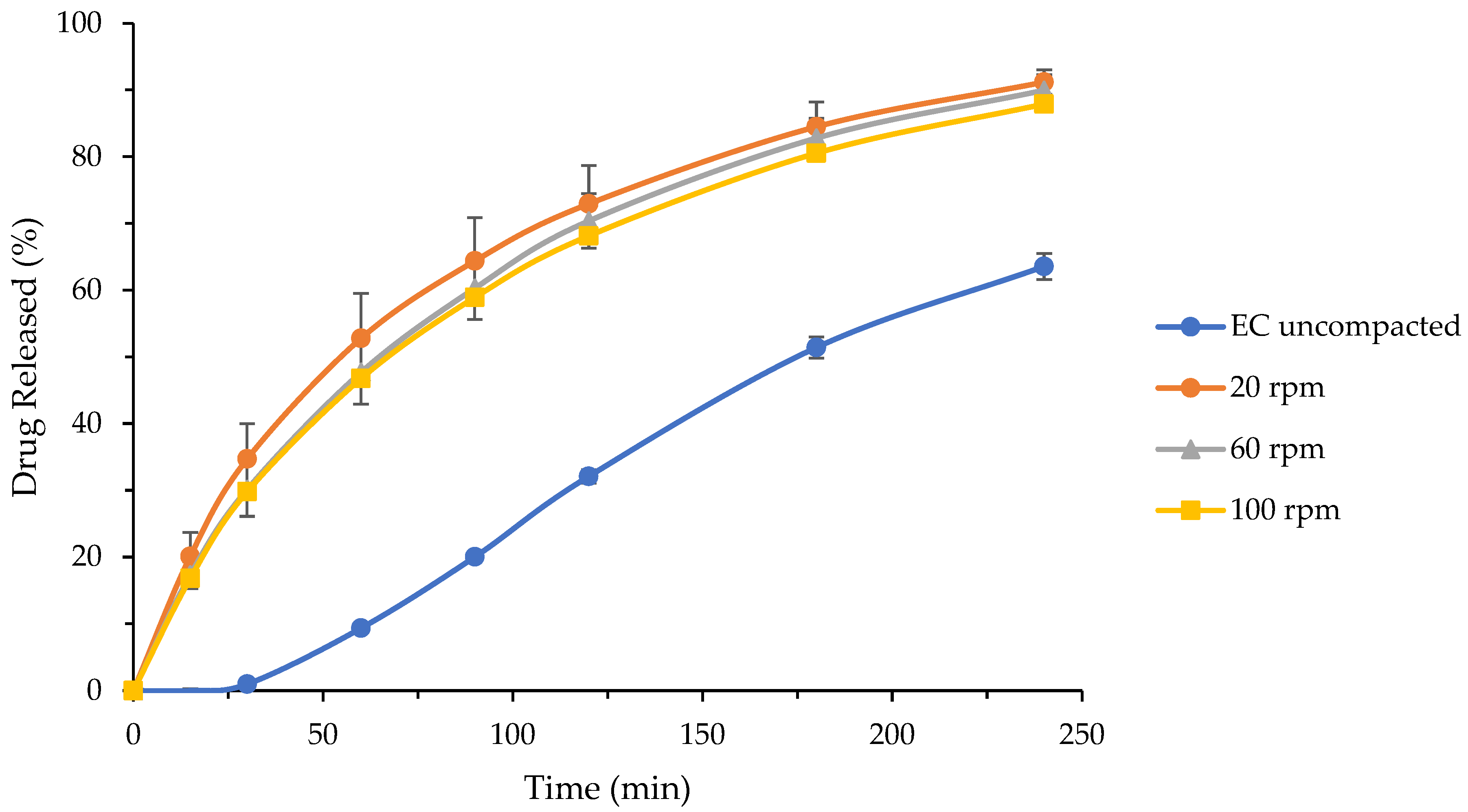 - Hosseini, A.; Körber, M.; Bodmeier, R. Direct Compression of Cushion-Layered Ethyl Cellulose-Coated Extended Release Pellets into Rapidly Disintegrating Tablets without Changes in the Release Profile. Int. J. Pharm. 2013, 457, 503–509. [Google Scholar] [CrossRef]