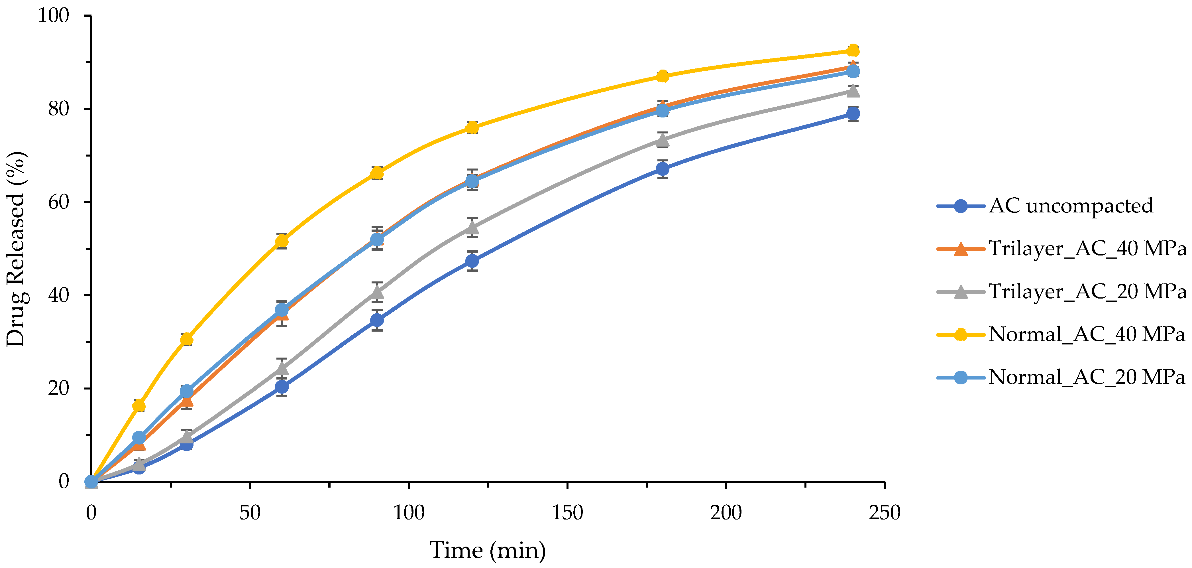 - Torrado, J.J.; Augsburger, L.L. Effect of Different Excipients on the Tableting of Coated Particles. Int. J. Pharm. 1994, 106, 149–155. [Google Scholar] [CrossRef]
