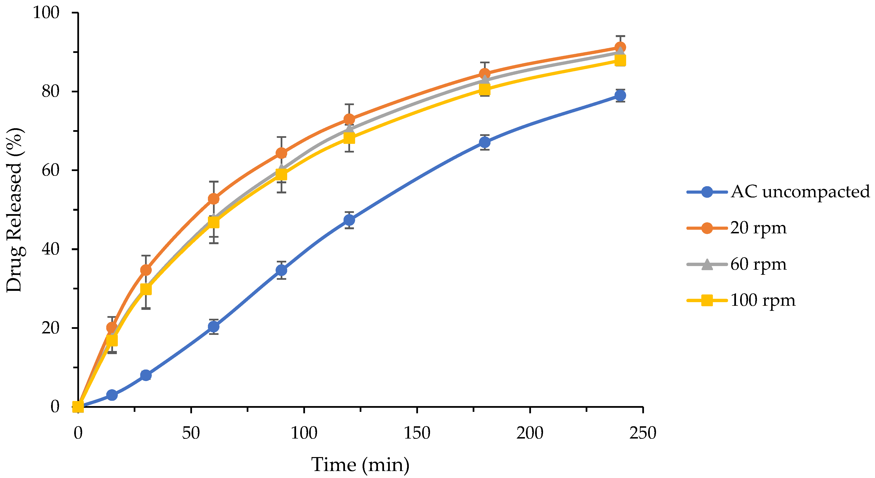 3.4. Impact of Tableting Rate on MUPS Tablets