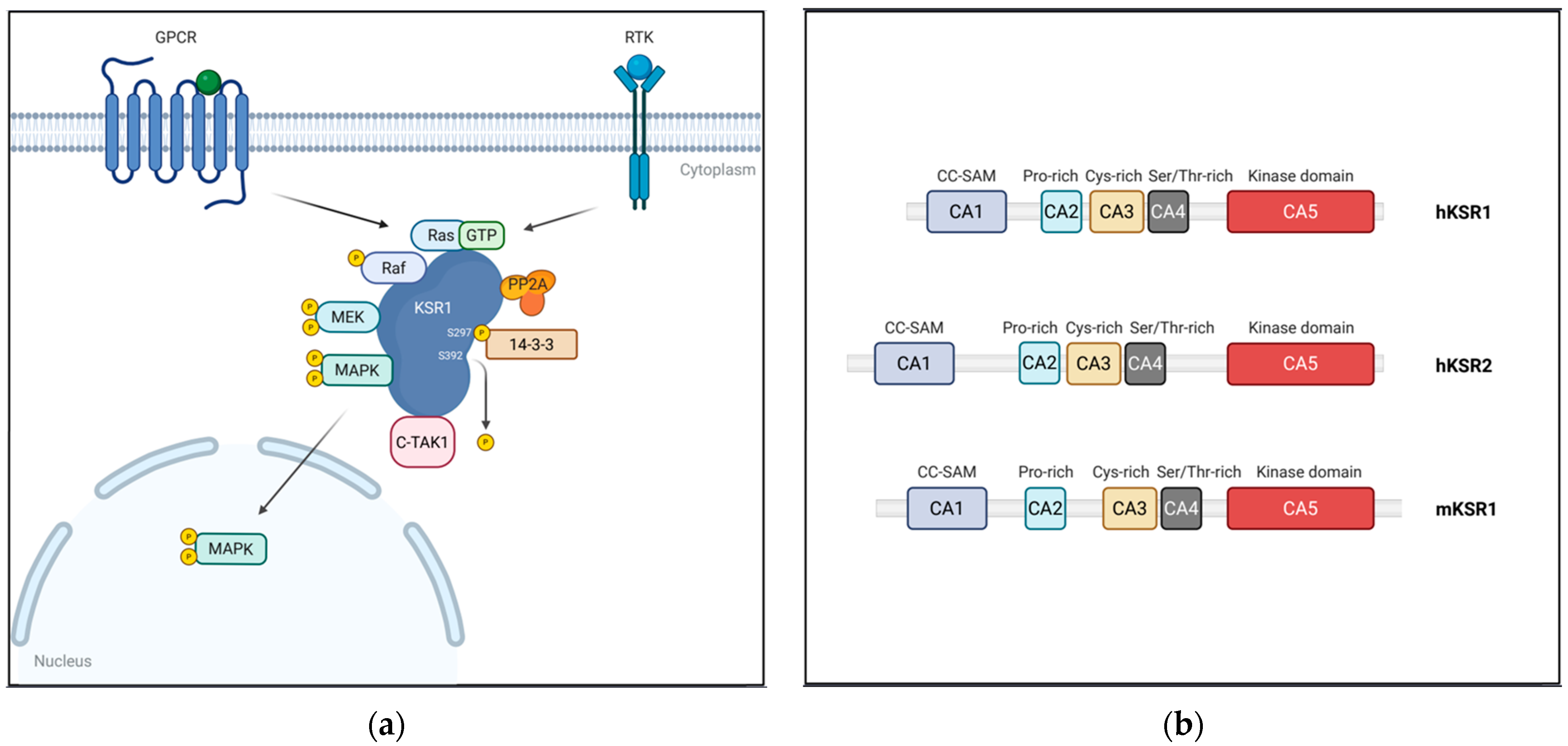 - Roy, F.; Laberge, G.; Douziech, M.; Ferland-McCollough, D.; Therrien, M. KSR is a scaffold required for activation of the ERK/MAPK module. Genes Dev. 2002, 16, 427–438. [Google Scholar] [CrossRef]