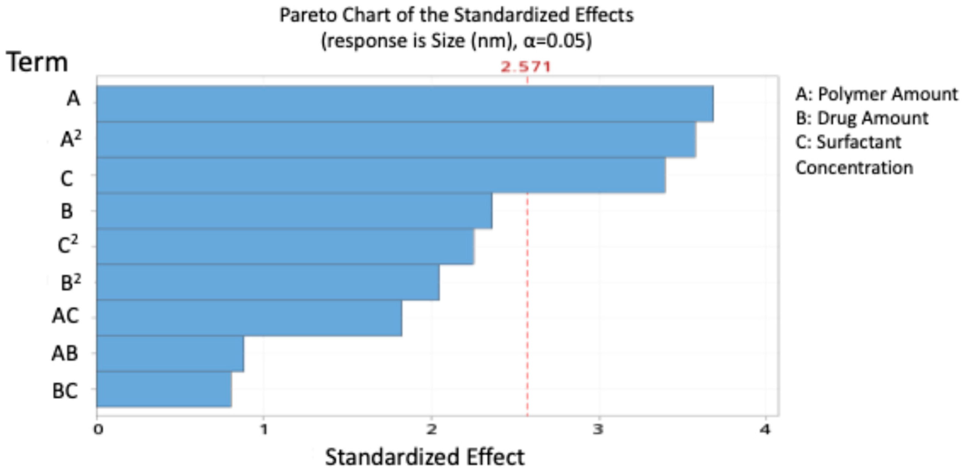 Pareto analysis (Figure 5) confirmed that drug (B), surfactant (C), and polymer (A) were the most significant contributors to EE.