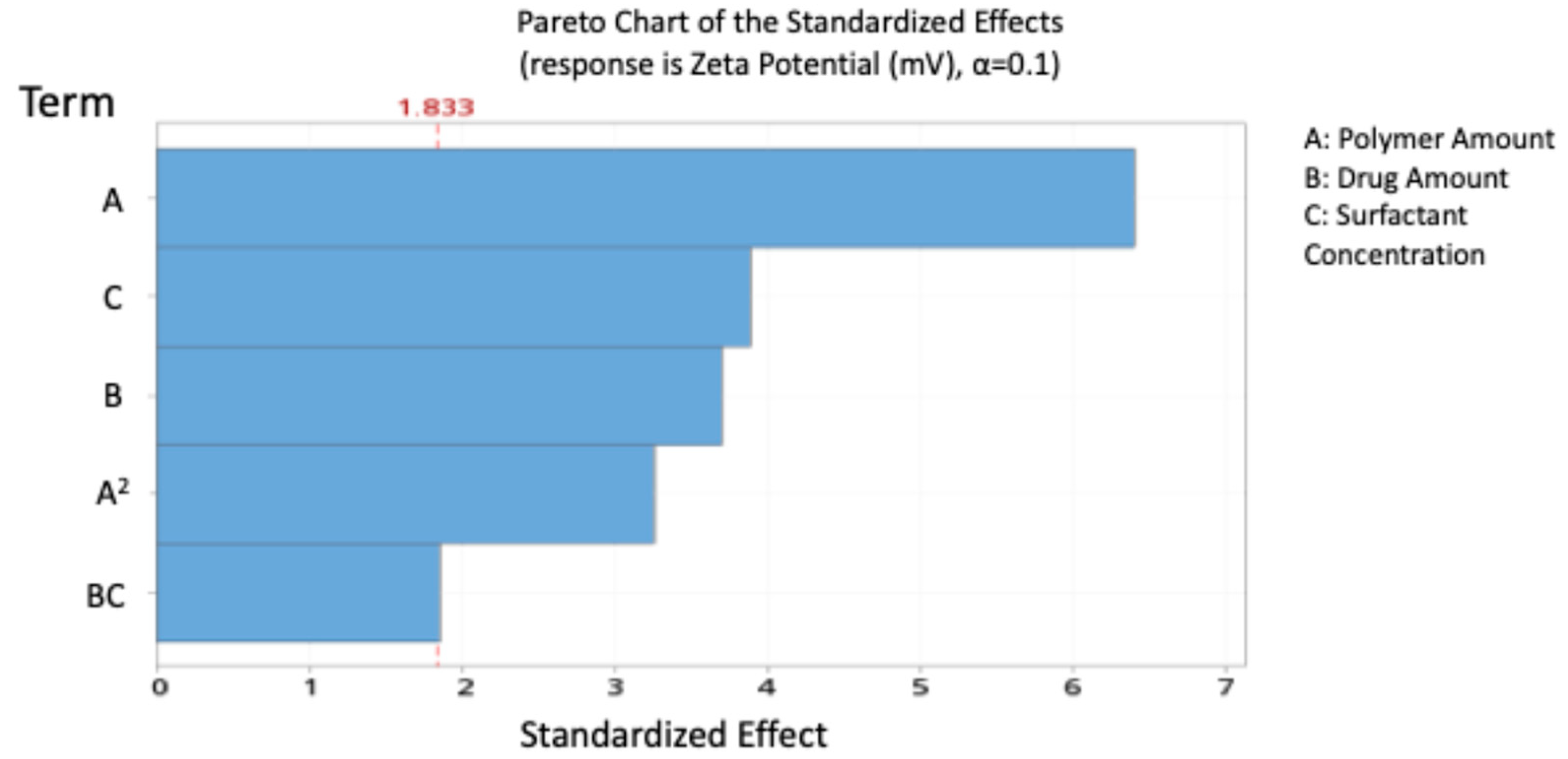 The standardised effect ranking (Pareto chart, Figure 3) highlighted A, C, B, and A2 as the most influential factors on zeta potential.